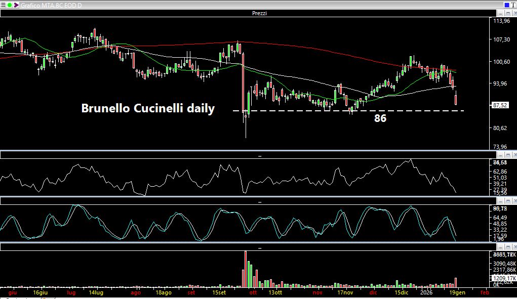 Su Brunello Cucinelli c'è stato invece un abbassamento del target price e pare che l'azione voglia dirigersi verso livelli chiave che identifico negli 86 euro.