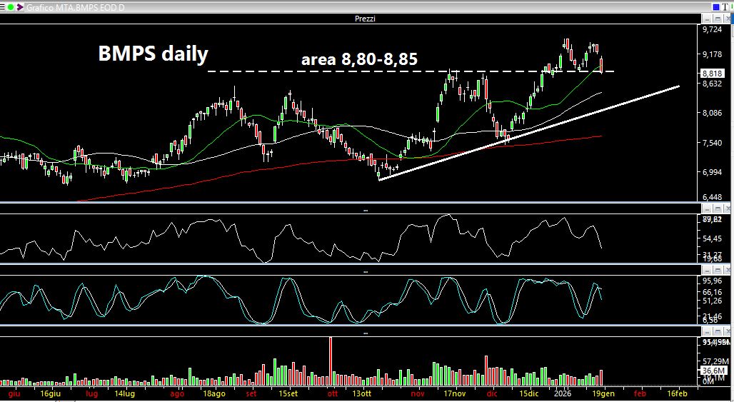 Partiamo con una considerazione: il titolo di questo articolo non è casuale. Il mercato è diventato veramente molto ostico e bisogna fare degli atti di fede: operare con un capitale estremamente basso e mantenere la posizione laddove viene pubblicata qualche notizia societaria positiva o negativa. Penso ad esempio all'abbassamento del target price sulle azioni di Brunello Cucinelli piuttosto che di Banca Farmafactoring che hanno portato ad un ribasso nell'ordine del 5% nel primo caso è del 10% o più nel secondo. Il movimento può essere originato anche da una notizia che può non essere vista bene dal mercato penso ad esempio al fatto che l'amministratore delegato Luigi lovaglio di Banca Monte Paschi possa non essere riconfermato nella carica. Anche in questo caso abbiamo assistito ad un ribasso del 4% di BMPS in una sola seduta e non mi stupirebbe se il ribasso proseguisse pur trovandoci in un punto di pullback. Sappiamo infatti che le machinette sono autoalimentanti, quindi occhio alla penna anche se i fondamentali rimangono naturalmente ottimi.