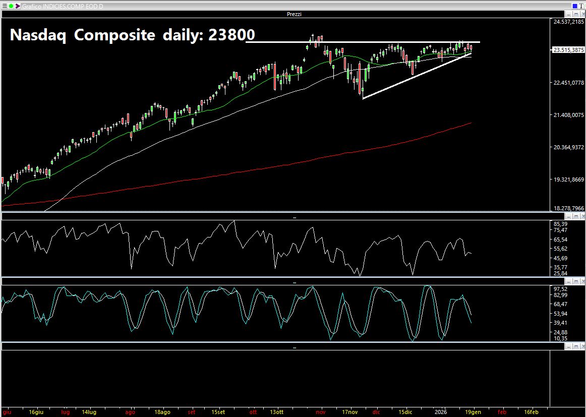 Il Nasdaq Composite continua a rimanere sui massimi, ma fa fatica a rompere con decisione l’area dei 23.800 punti. Ci troviamo anche in questo caso in una fase di compressione della volatilità. Graficamente è ineccepibile il fatto che ci siano minimi crescenti e massimi allineati e che, quindi, dal punto di vista dell’analisi tecnica possa esserci un’ulteriore spinta rialzista; altrettanto francamente, però, faccio fatica a mettermi lungo in questo momento. La positività permane finché viene tenuta la trendline dinamica ascendente.