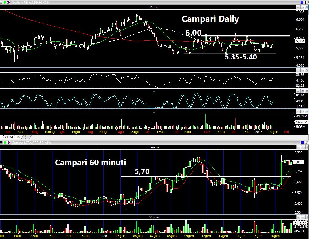 Siamo al 50 e 50: come gettare la moneta. Venerdì è stata ben comprata facendo segnare un rialzo del 4%. Di fatto il trend è choppy e laterale: fascia bassa a 5,35-5,40 ed alta a 6 euro. Il close settimanale è stato a 5,844 euro. Sfruttabili eventuali ritracciamenti verso 5,70-5,75 in assenza di notizie naturalmente. Stop a 5,60.