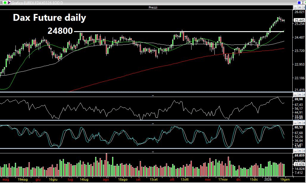Più lineare appare ai miei occhi il movimento del future sull’indice DAX, che dopo il breakout dell’area collocata attorno ai 24.800 punti sta formando una bandiera, o comunque una fase di congestione ben visibile dalle ultime quattro candele. In questo caso, dunque, a differenza degli indici americani, il trend sull’azionario europeo continua a mostrare una maggiore positività. Eventuali punti di appoggio possono essere rappresentati dal test dei 25000 punti rispetto al close weekly a 25445. Al momento dunque non vedo motivi per inversioni del trend.