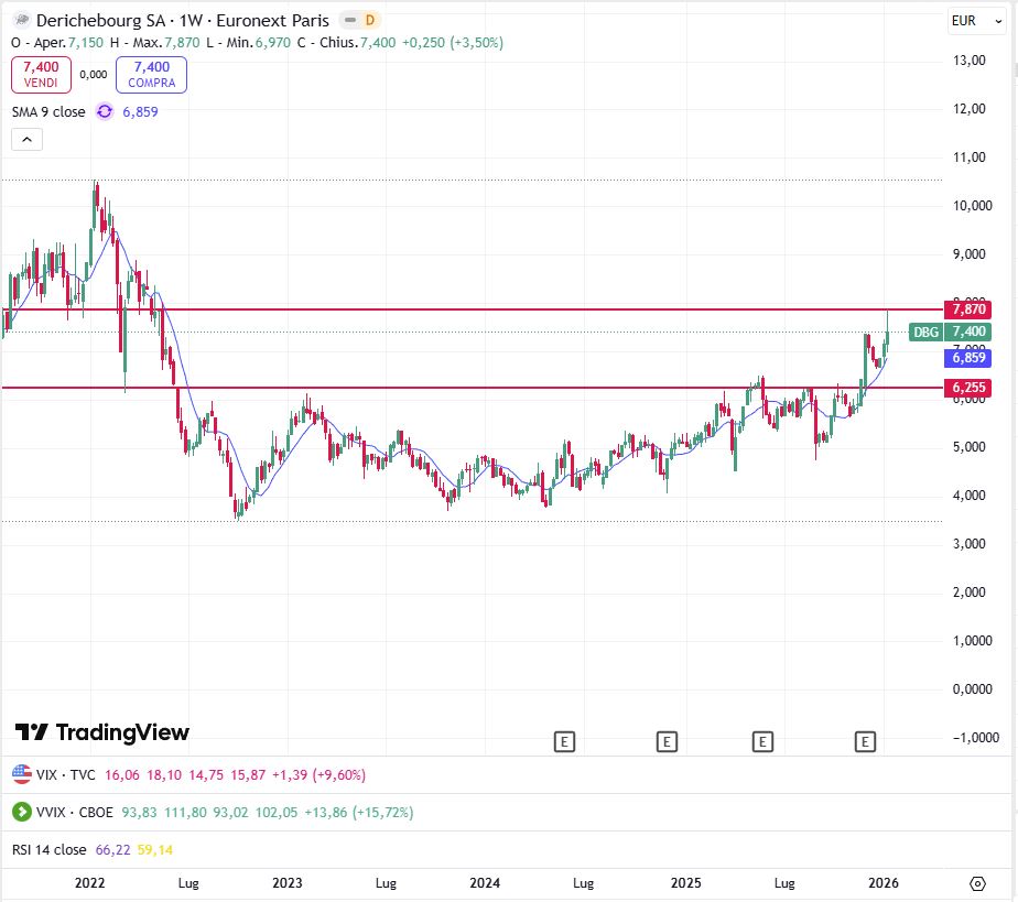 Su scala settimanale c'è stato un buon allungo verso una prima vecchia resistenza a 7,87 e una chiusura di ottava a 7,40. Finchè rimane sopra 6,50 (punto di swing di 3-4 settimane fa) può proseguire.
