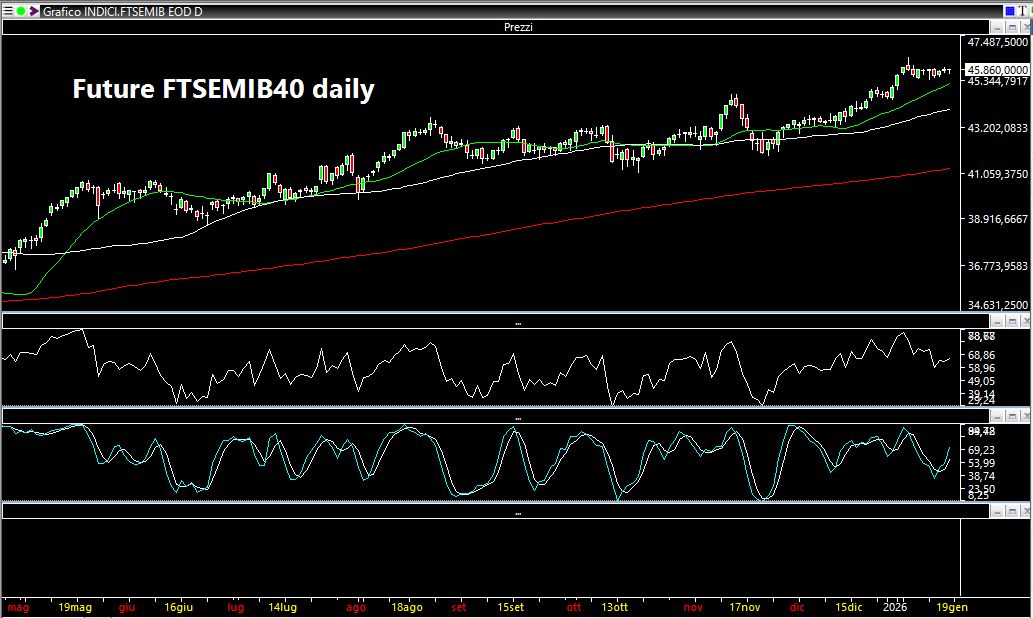 In Italia il FTSEMIB future rimane in laterale e sembra aver voglia di continuare nel trend rialzista. Possibile indebolimento solo sotto 45300 (media mobile di colore verde attualmente passante attorno a 45340 punti) rispetto al close settimanale a 45860.