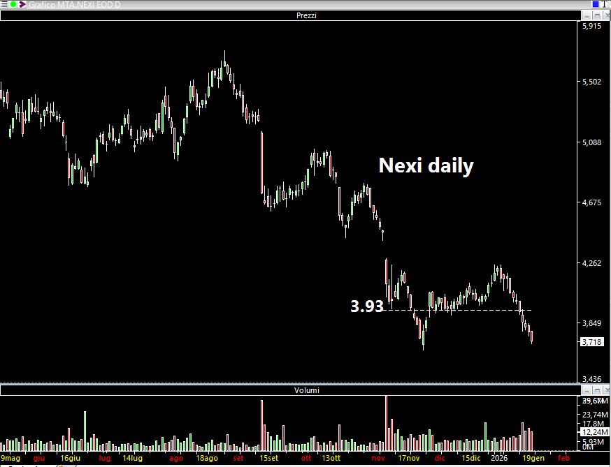 E' andata in stop la seconda metà a 3,93. Provvidenziale il fatto di aver messo uno stop valido anche per l'intraday. Questo è il classico esempio di azioni che quando iniziano a scendere continuano nel movimento. Se fino ad una settimana fa si poteva intravedere l'ipotesi di una consolidamento per una inversione di breve, ora mi sembra che tale ipotesi sia del tutto vanificata.