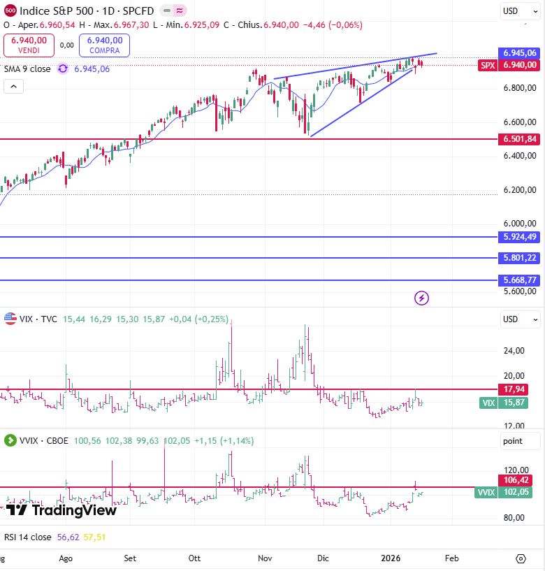 Si chiude una settimana caratterizzata da una fase sostanzialmente laterale per l’S&P 500, che rimane comunque sui massimi storici in area 7.000 punti. Close settimanale a 6.940. Mettersi lunghi ora è un azzardo perché, come vedremo, ci sono davvero molti falsi segnali e le notizie del weekend porteranno molto probabilmente un po' di volatilità. Quest'ultima rimane nel complesso contenuta in area 16 punti, anche se la sua derivata seconda, espressa dal VVIX, è in leggero rialzo. È come se i mercati stessero aspettando qualcosa, un qualche evento, ma questa è solo una mia sensazione.
