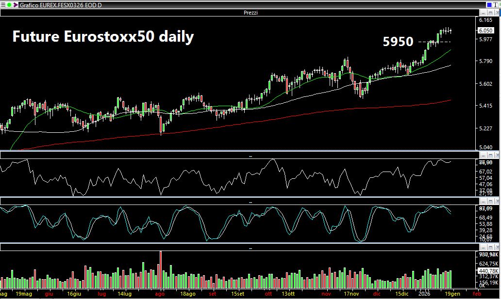 Buona anche l'impostazione del Future Eurostoxx50 che rimane sui massimi di periodo seppur con diverse candele doji che rappresentano una sostanziale indecisione. Possibili aree di pullback di breve verso i 5950 punti. Close settimanale a 6050 punti.