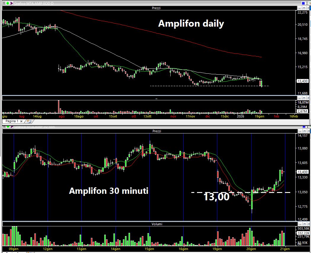 Una rondine non fa certamente primavera specialmente in questo periodo di freddo. Dopo un tentativo di breakout ribassista nella seduta di ieri (che certamente mi ha tratto in inganno), oggi è stata molto ben comprata Amplifon. Il grafico daily è impietoso e i volumi sono stati leggermente inferiori rispetto a ieri. Interessante tuttavia la bullish engulfing da manuale. Concettualmente con i chiari di luna geopolitici e l'incertezza generale sarebbe stato lecito aspettarsi una continuazione del ribasso. Invece non è stato così. Ripeto: ci troviamo in un mercato in cui tutto è il contrario di tutto, Amplifon si trova pur sempre al di sotto delle medie a 20 e a 50, ma teoricamente gli stop sono scattati tra ieri e l'open odierno. Per un amante del gambling sarebbe un potenziale long market on close a 13,43 (o con un minimo di ritracciamento domani) con uno stop tassativo sul minimo di oggi a 12,65 euro. In realtà per chi ama il rischio "ridotto" si potrebbe pensare a smezzare l'operazione già sotto i 13 euro visibili sul grafico a 30 minuti.