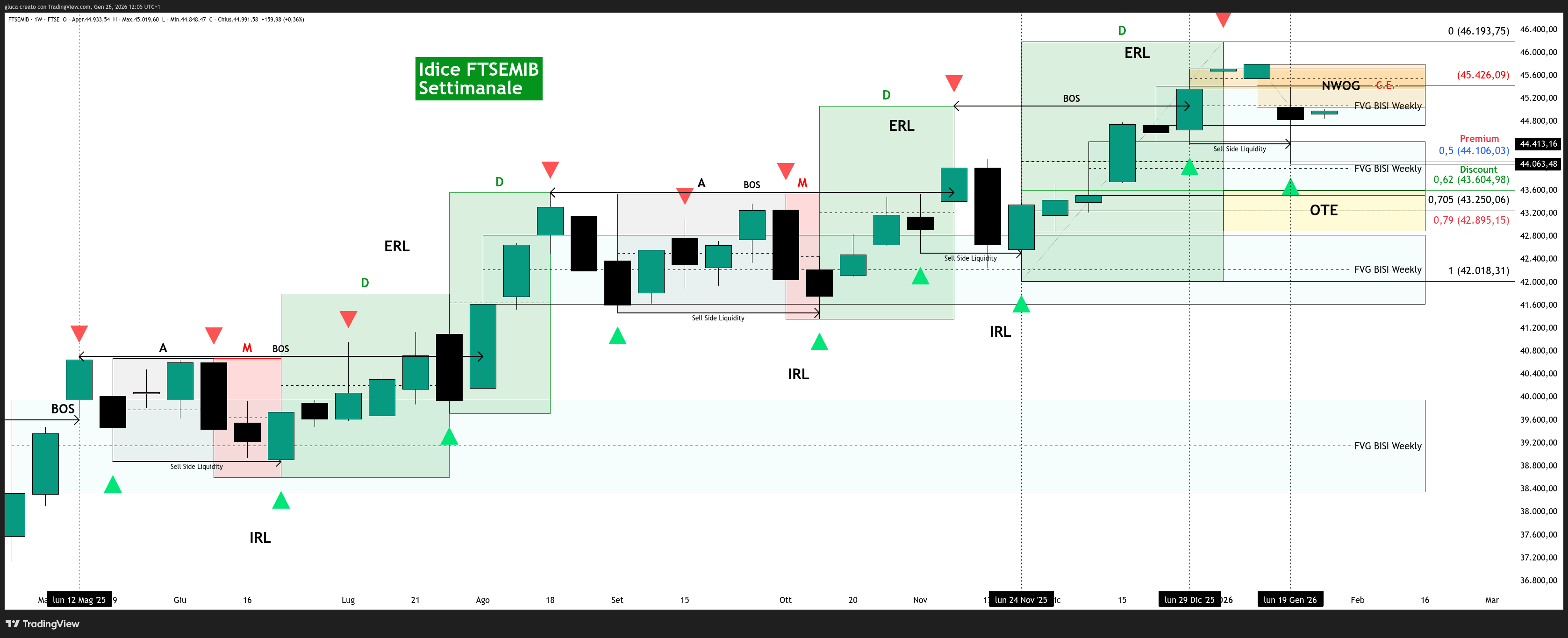 La chiusura settimanale a 44831,60 sopra il minimo del 29 dicembre ha scongiurato, almeno per ora, un ritracciamento più profondo verso la zona OTE (Optimal Trade Entry), ovvero l’area statisticamente più favorevole per cercare acquisti.