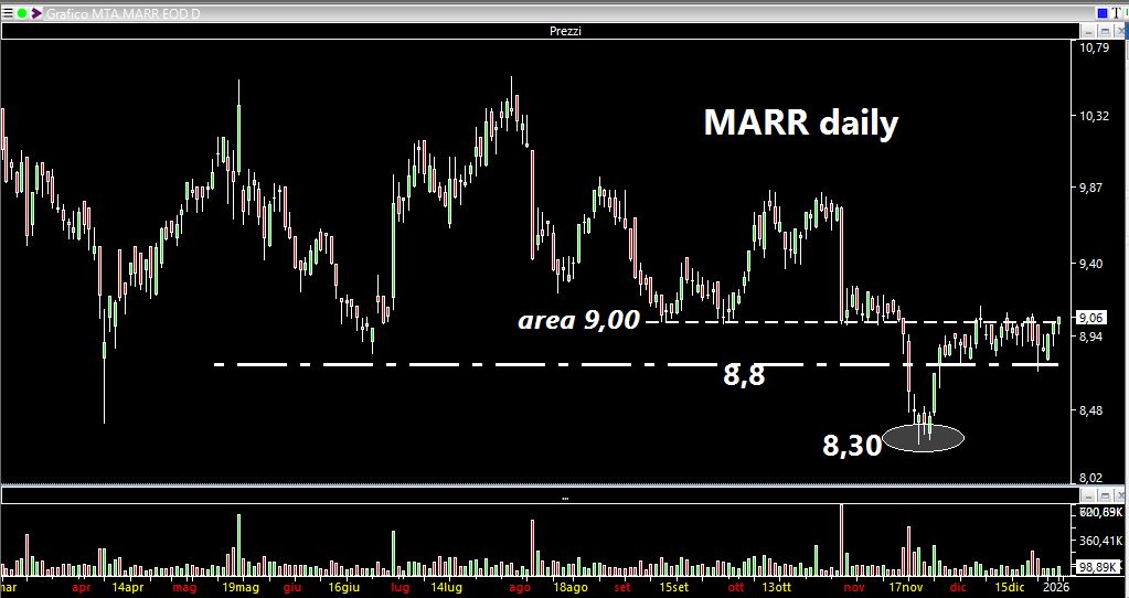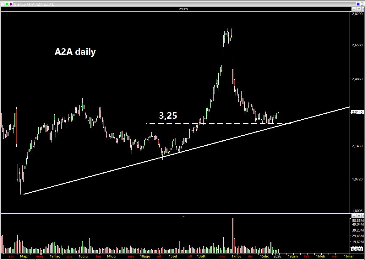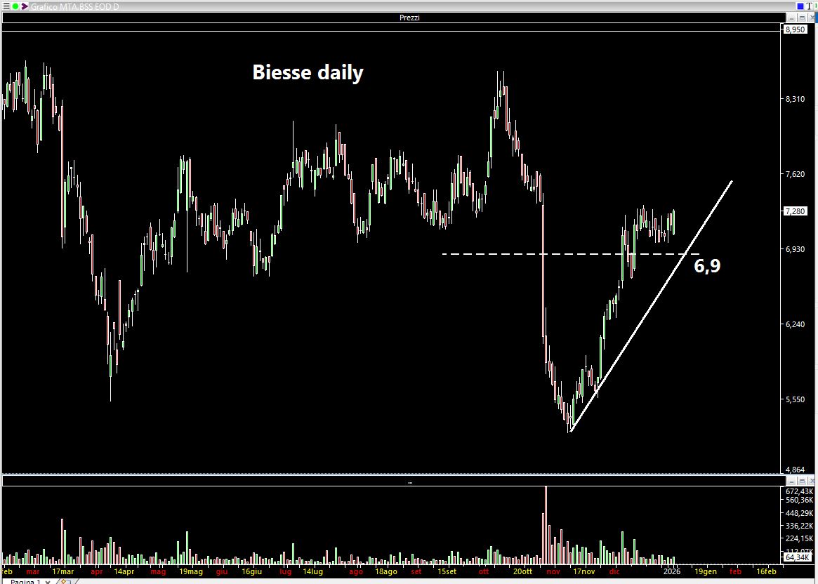 Questo è uno dei casi che non mi sarei aspettato di vedere ovvero quello di un'azione in forte ribasso nel mese di ottobre e novembre caratterizzata da un successivo e repentino movimento a "V". In caso di long alla bersagliera collocherei lo stop a 6,90 rispetto ai 7,28 euro della chiusura di venerdì. Possibile una continuazione del trend per cercare l'area attorno al 7,6 euro. Rimane una scommessa.