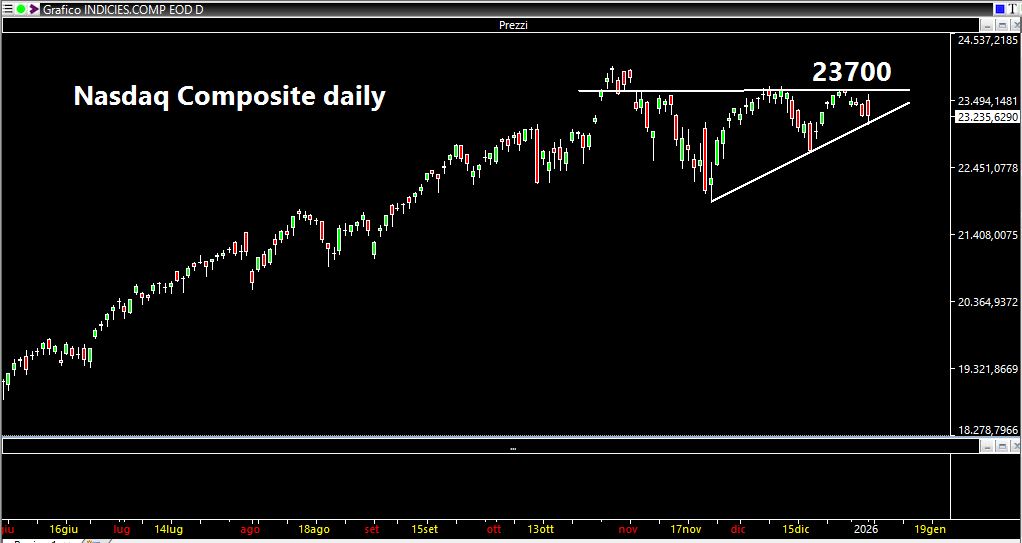 Il Nasdaq Composite si trova compresso tra la forte resistenza a 23700 punti e la trendline dinamica ascendente che vedete nel grafico successivo su scala giornaliera. Positiva l'eventuale rottura dei 23700 punti.