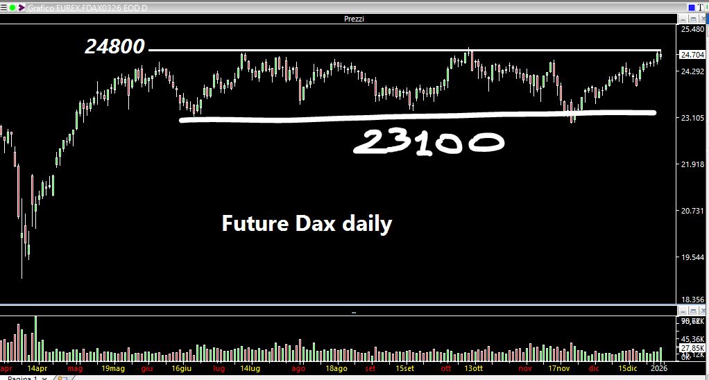 In Europa il Future Dax si è portato a ridosso della forte resistenza a 24800 che lo ha sempre respinto da sei mesi a questa parte. Al di sopra di questo punto troviamo i 25000 punti che rappresentano un livello psicologico. Personalmente ritengo che sia una azzardo mettersi long su questi livelli: molto più logico aspettare una rottura e la formazione di un uncino per ridurre il rischio o la possibilità di un falso breakout. A dirla tutta la rottura di 24800 punti sancirebbe l'uscita dal lungo trading range che dura da giugno dello scorso anno e quindi a livello teorico ci sarebbe la possibilità di un rialzo di almeno 1000 punti (quindi almeno del 4%), rialzo dato dalla proiezione verso l'alto dell'altezza del rettangolo con base a 23100-23200 punti e altezza a 24800.