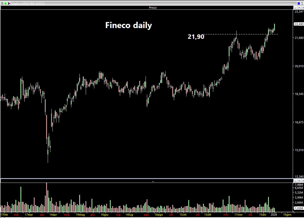 Ci vuole cuore e fegato. Ha uncinato al rialzo sui massimi storici. Finché la barca va....lo scoglio potrebbe essere a 21,90 (stop strettissimo, me ne rendo conto). Qualche punto percentuale potrebbe ancora farlo (flusso di notizie permettendo, come sempre).