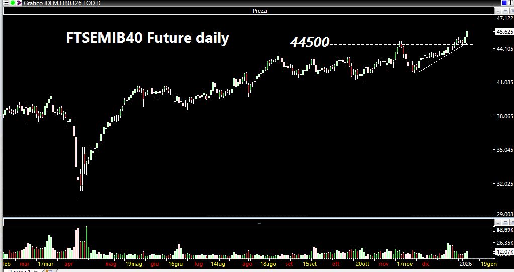 Il nostro FTSEMIB40 Future è decisamente più forte dell'indice tedesco e lo si vede a vista d'occhio. Per il momento view rialzista, almeno finché si rimarrà al di sopra dei 44500 punti (il close settimanale è stato a 45625).