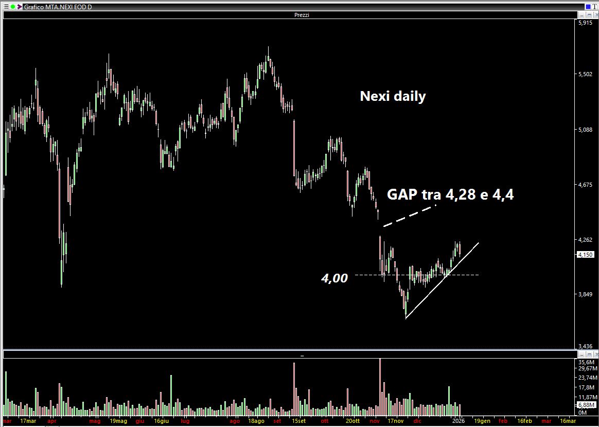 E' arrivata alla prima area target indicata -e superata- posta a 4,20 euro (massimo@4.245 euro). Alla prima area è sempre bene smezzare la posizione. Tra 4,28 e 4,40 abbiamo la "famosa" ricopertura del gap. In ogni caso stop sotto 3,97 euro market on close.