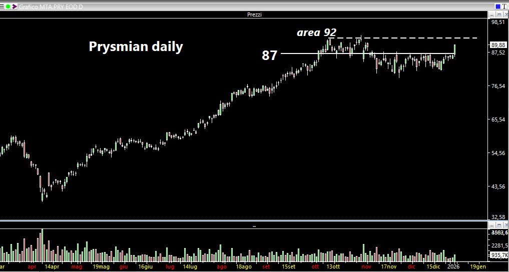 Bello strappo rialzista nella seduta di venerdì, col breakout di 87 euro. In area 92 troviamo i massimi storici e mi aspetto che vengano ritoccati. Al momento brutto il rientro sotto 87 euro.