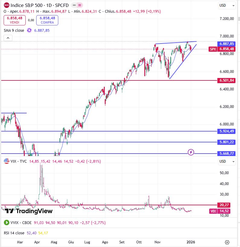 L'S&P500 rimane sostanzialmente sui massimi, sostenuto da una trendline dinamica ascendente ben inclinata anche se mi aspetto una fase sostanzialmente choppy e laterale senza fughe repentine verso l'alto. Anche la volatilità rimane nel complesso estremamente bassa. Credo che se il mercato riuscisse a riportarsi al di sotto dei 6800 potremmo vedere un pò di tensione ma al momento rimane tutto immobile.