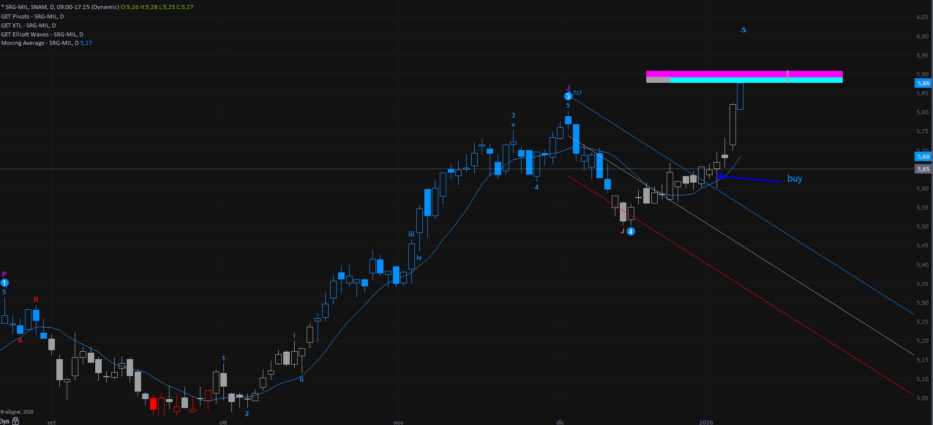Oggi, sostanzialmente, anche Snam è arrivata a target. Come sempre, il raggiungimento dell’obiettivo non implica che il titolo non possa proseguire ulteriormente al rialzo e quindi è gestibile con strumenti di protezione come la media mobile, il canale di regressione o un classico trailing stop.