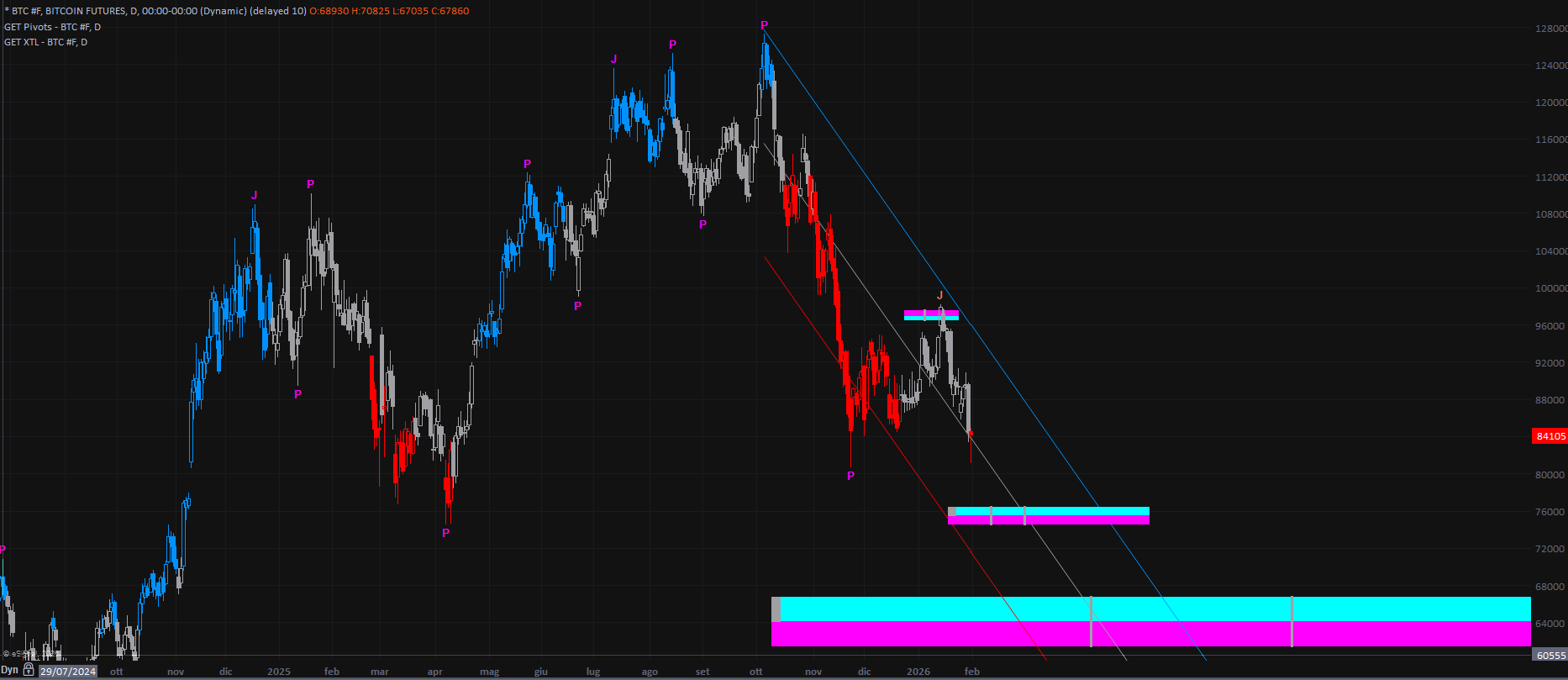 In caso di prosecuzione del ribasso, l’area compresa tra 62000 e 66500 emerge con una MOB particolarmente rilevante, che potrebbe offrire elevate probabilità di arresto del movimento correttivo qualora le quotazioni dovessero spingersi fino a quei livelli.