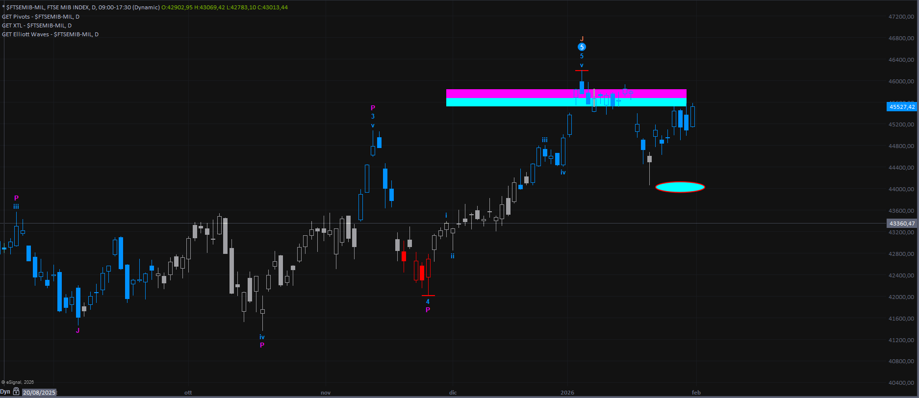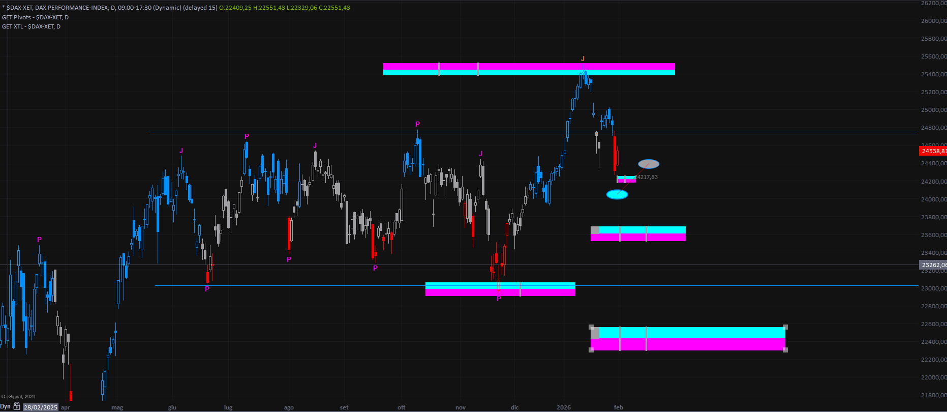 Al momento le quotazioni si trovano in prossimità di un supporto minore, di natura “doppia”, formato dalla convergenza di una ellipse e di una piccola MOB. Qualora tali livelli non dovessero riuscire a sostenere il mercato, il prossimo obiettivo correttivo sarebbe individuabile in area 23600.