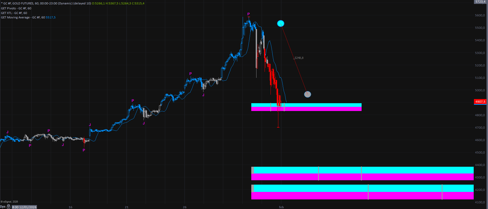Nel grafico del future dell'oro a 60 minuti si osserva come le quotazioni si siano fermate su un’area di supporto compresa tra 4850 e 4900. Da qui si aprono, come sempre, due possibili scenari: un rimbalzo tecnico, che potrebbe estendersi almeno verso area 5200/5300 (fino a lì rimane l'ipotesi di semplice rimbalzo), oppure una violazione della MOB, con successiva discesa verso i prossimi obiettivi individuabili intorno a 4380/4100, livelli particolarmente rilevanti.