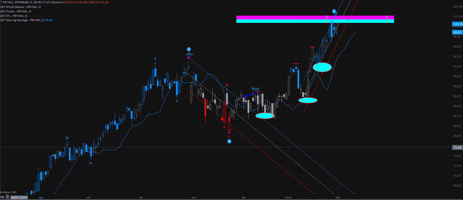 Cominciamo con l’unico titolo che figurava tra gli “osservati” nel nostro ipotetico trade, ovvero Prysmian. Il titolo ha raggiunto il target previsto e, come faccio abitualmente in questi casi, considero il movimento completato e lo rimuovo dalla lista.