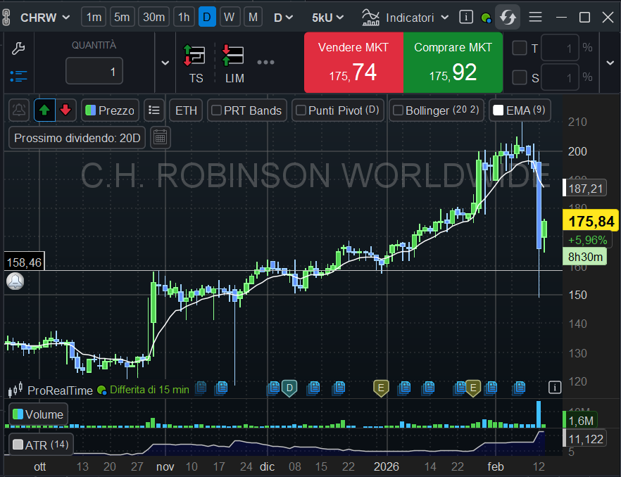 Cari trader e investitori, benvenuti al consueto appuntamento del weekend con l’analisi dei mercati. La settimana che si è chiusa ieri, venerdì 13 febbraio, è stata tutt’altro che sfortunata per chi ama la volatilità, ma per molti di noi lascia in eredità un classico misto di emozioni: la soddisfazione di aver letto il movimento e il pungente rammarico per averlo sfiorato senza cavalcarlo appieno. Parliamo di occasioni, di violenti storni e della "cattiveria" bellissima di certi movimenti, con un focus sul caso da manuale di C.H. Robinson Worldwide (CHRW).