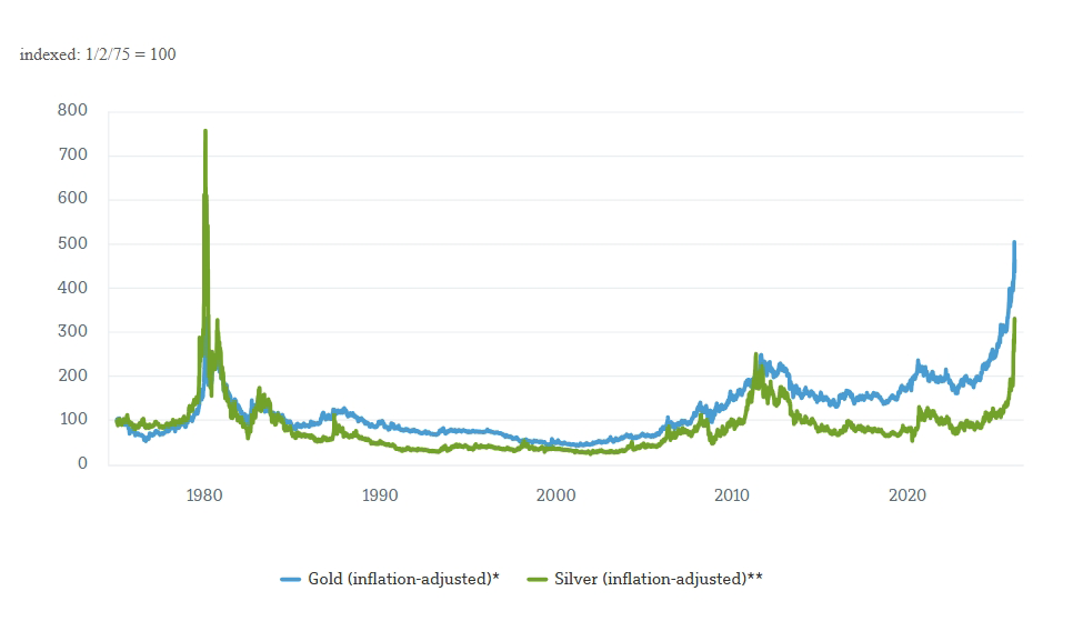 Uno studio di DWS, società di gestione patrimoniale tedesca, ricorda che gold e silver possono muoversi rapidamente e poi ancora più rapidamente. Il grafico qui sotto mostra l'andamento di lungo periodo dei loro prezzi in termini reali, ossia al netto dell'inflazione.