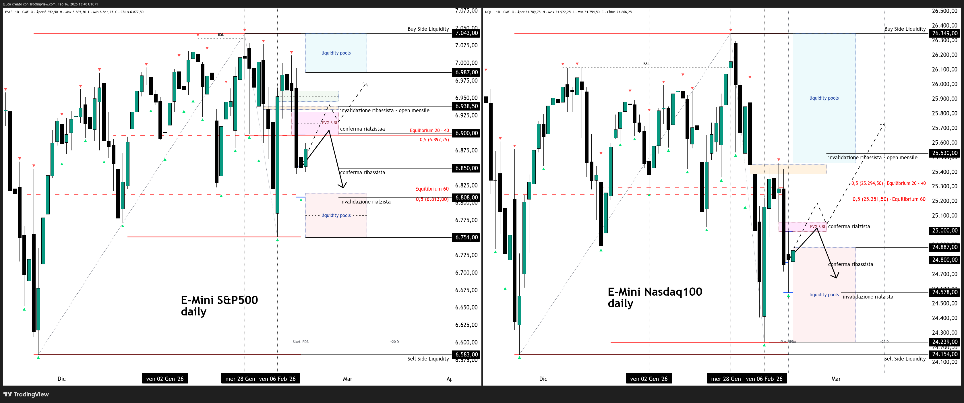 La settimana appena chiusa (9-13 febbraio) è stata chiaramente bearish su entrambi gli indici: S&P500 ha aperto a 6960 e chiuso a 6850, il Nasdaq da 25153 è scivolato a 24803. Una settimana a prevalenza ribassista, con chiusura settimanale nettamente negativa nonostante qualche tentativo di recupero nel mezzo. E soprattutto, entrambi i futures si trovano ora sotto l'open mensile di febbraio (S&P a 6938, NQ a 25530): primo segnale di debolezza strutturale mensile.