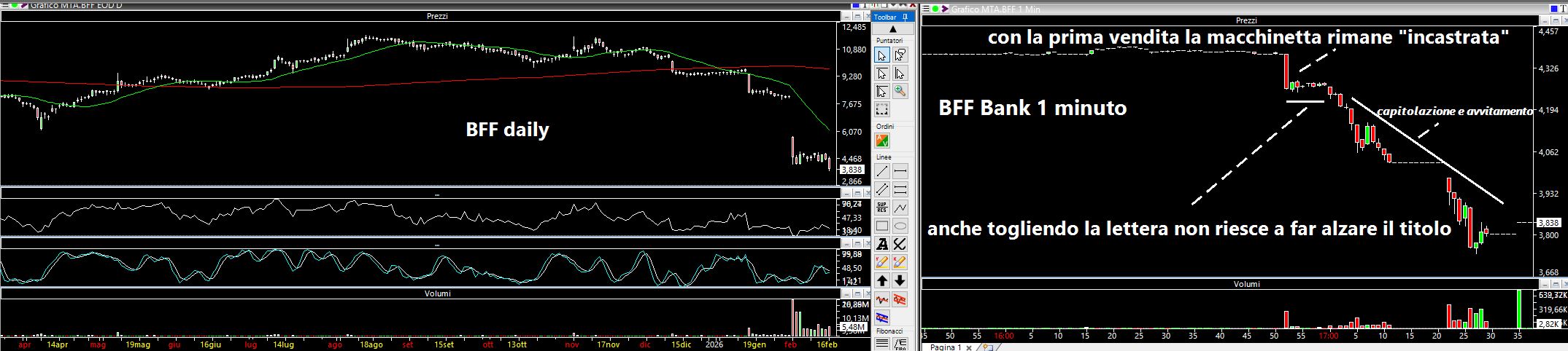 L'altro caso del giorno è quanto successo alle azioni di BFF Bank che già erano crollate a inizio febbraio. Questa volta è interessante far nuovamente osservare al lettore la tecnica che viene utilizzata per far "saltare" i quotatori bid/ask (che andrebbero vietati visto che non forniscono una reale intenzione di acquistare/vendere e si spostano in continuazione a seconda di come sono colpiti e questo naturalmente permette di far salire e scendere i titoli). Come avevo già evidenziato nell'articolo di domenica relativamente ad Interpump, anche questa volta c'è stato un primo grosso ordine in vendita da circa 360.000 pezzi che ha portato il titolo da 4,37 € a 4,25 euro nell'arco di pochi secondi. Tale vendita è dovuta all'apertura di indagini da parte della Procura di Milano per falso in bilancio (fonte: Milano Today), notizia curiosamente uscita 30 minuti prima della fine delle contrattazioni in una giornata priva di scambi e con bassi volumi a causa della festività americana. In questo modo le macchinette che immettono e tolgono ordini in continuazione in bid e in ask si sono trovate sbilanciate dal lato long come si nota chiaramente nel grafico ad un minuto. Nei 5 minuti successivi hanno cercato di far risalire il titolo revocando parzialmente la lettera ma non ci sono riuscite. Solo l'arrivo di una seconda grossa vendita ha poi innescato quello che chiamo "movimento a valanga": avendo acquistato inizialmente non hanno potuto fare altro che ribaltarsi e il risultato finale è stato di un ribasso di 12 punti percentuali nell'arco di una mezz'ora di contrattazione. Se da un lato è fondamentale il fatto che non ne venga vietato l'utilizzo, dall'altro ne capite il bug e come possa essere sfruttato.