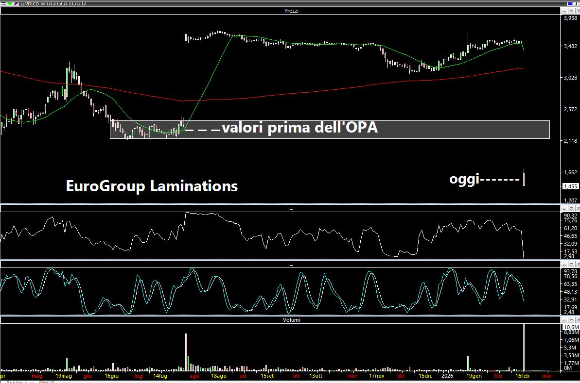 La seduta odierna con Wall Street chiusa per la festività del Presidents' Day ha in realtà visto due casi eclatanti. Il primo relativo al "salto" dell'OPA su Eurogroup Laminations a causa dello stop da parte dell'India: Ems, il principale azionista, insieme alla società di private equity cinese, ha comunicato di aver «preso atto dell’impossibilità» di ottenere dalle autorità di Nuova Delhi l’autorizzazione richiesta in materia di investimenti esteri diretti. Ricordo che ne avevo scritto come esempio di manipolazione da notizia a mercati aperti in un articolo di circa un mese fa che trovate a questo link: https://www.lombardreport.com/2026/1/18/azioni-a2a-azioni-derichebourg/