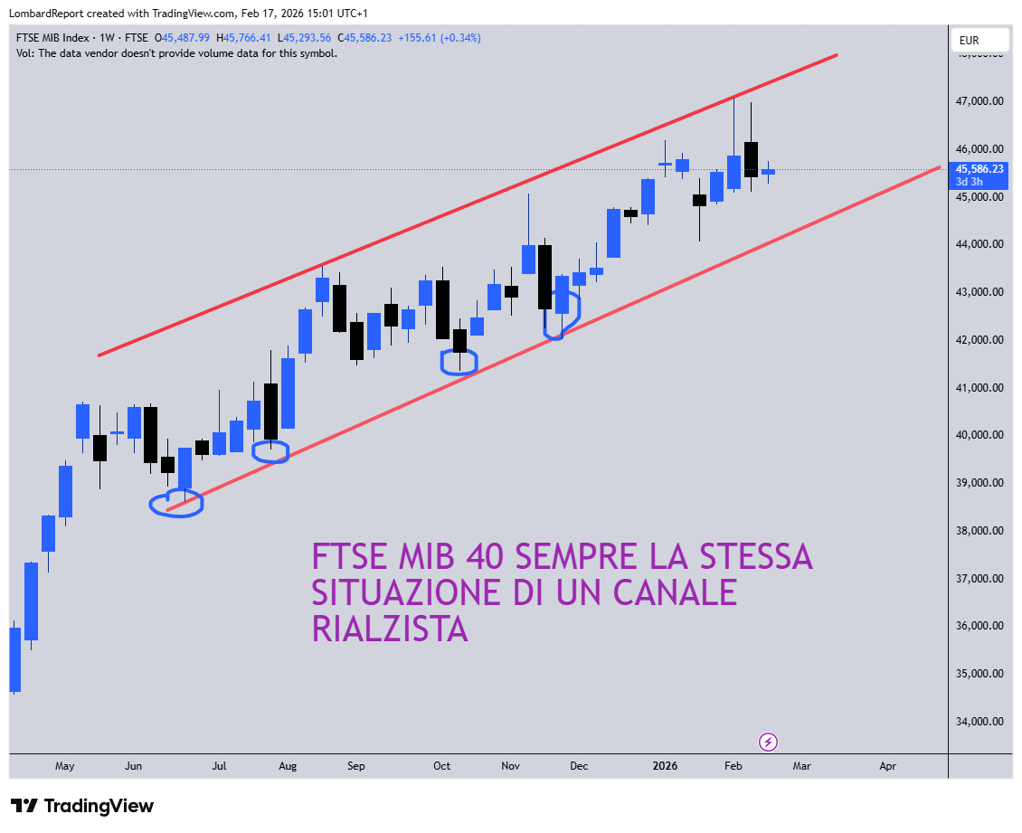La situazione del mercato azionario USA sul grafico settimanale, che è quello che conta, è sempre la stessa di quella del Ftse MIB 40: rialzo. Nient’altro che rialzo, lento ma deciso. E postiamo il grafico questa volta del Ftse MIB40 per dimostrare questo assunto, banale fin che si vuole ma anche tranquillizzante.