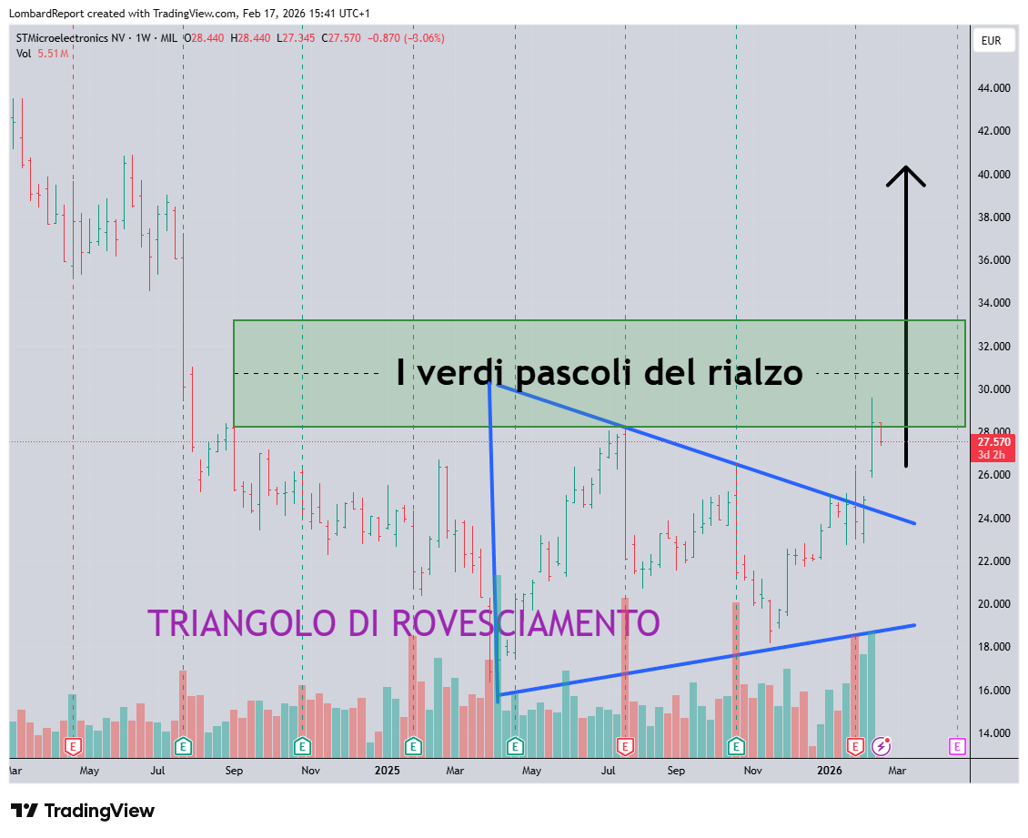 STM: vale il grafico che avevamo postato illo tempore e ora dobbiamo fare quello che ci eravamo ripromessi cioè comprare. STM si è portata in zona verdi pascoli superando di slancio ben 3 massimi precedenti relativi e quindi non possiamo fare altro che constatare che è alla fuoriuscita da un triangolo di rovesciamento. E bene ora che scende perché ci dà la possibilità di comprare.