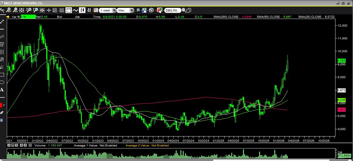 Detto questo registro l'ottima seduta di una azione estera trattata recentemente: Derichebourg sulla quale abbiamo individuato molto bene il pattern di rounded bottom all'inizio di dicembre dello scorso anno (link: https://www.lombardreport.com/2025/12/6/azioni-digital-bros-azioni-derichebourg/) e che trovate di seguito sul grafico settimanale. L'azione si è portata dall'area 7,00-7,40 fino ad un massimo odierno a 9,72 euro. Un briciolo di fortuna non guasta mai, specialmente in tempi in cui l'errore costa carissimo. Per questo ridurre il carico mano a mano è sempre cosa saggia, buona e giusta.