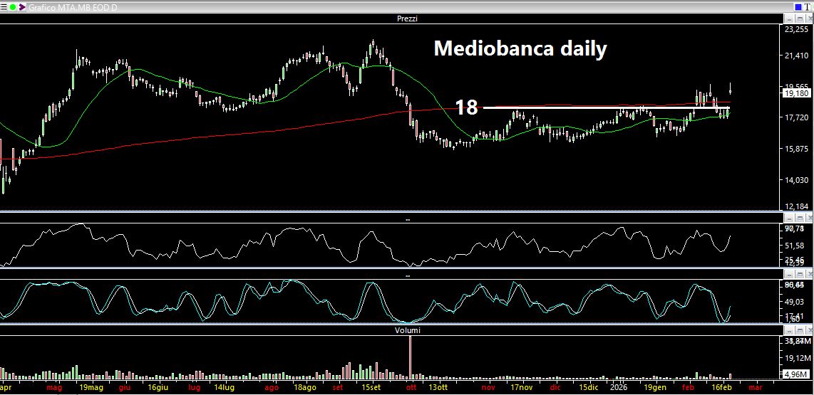 Seduta all'insegna della positività sui principali listini azionari, in una giornata che ha visto pochi spunti operativi. Salta all'occhio la buona performance di Mediobanca in seguito alla notizia, uscita ieri sera, di delisting del titolo. Come avevo anticipato qualche settimana fa, si poteva configurare uno scenario rialzista al di sopra dei 18 euro ed un altro al di sotto di questa soglia o, meglio, di quest'area. Il 27 febbraio di riuniranno i due CDA per valutare il concambio che, si spera, sia congruo. Fino a qualche mese fa, nell'ambito dell'OPS, era stato di 2,533 azioni BMPS per ogni Mediobanca portata in adesione con l'aggiunta di un premio cash di 0,90 euro ad azione. Sarà così anche questa volta oppure il concambio sarà ridotto? Naturalmente sarà importante che il driver (Montepaschi) nel frattempo non crolli altrimenti trascinerebbe al ribasso anche Mediobanca come è logico che sia.