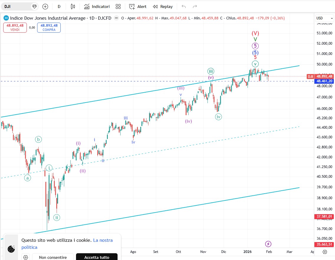 LS&P500 ha chiuso oggi sui livelli del 26 dicembre a 6.939,03 punti sei punti sotto quella chiusura. L’ultimo massimo intraday lo troviamo comunque il 28 gennaio a 7002,28 punti che ha completato un ending diagonal abbastanza sporco nella sua forma. Un calo sotto 6789,05, il minimo del 20 gennaio confermerà il completamento del pattern e potrebbe dare inizio all’inversione di tendenza. Da seguire.