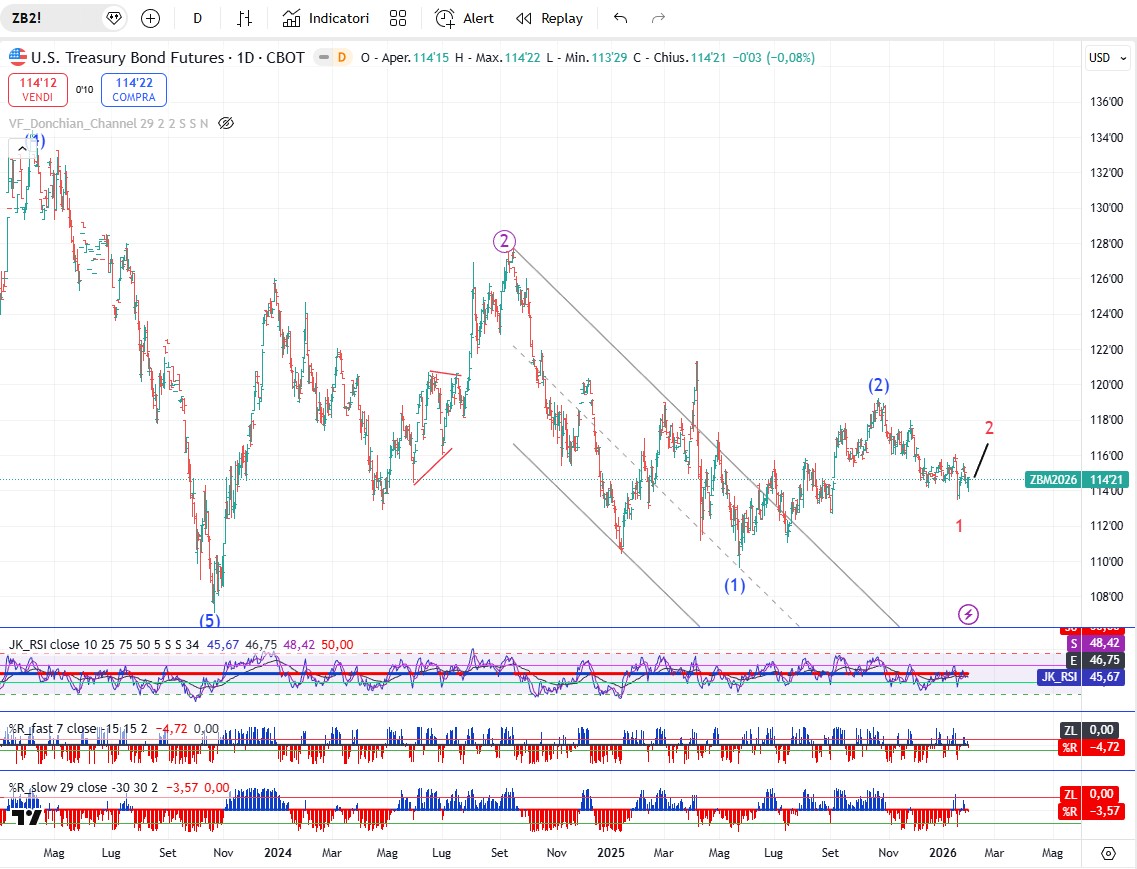 Il trentennale del Tesoro americano continua nel suo trend ribassista che seguiamo da anni. I prezzi hanno tracciato una serie di minimi e massimi decrescenti dal 22 ottobre quando l’onda (2) di grado intermedio ha segnato il suo massimo. Da allora è partita l’onda (3) che dovrà sviluppare un cinque onde ribassista. L’onda 1 dovrebbe essere già conclusa, mentre l’onda 2 è in corso e dovrebbe spingere i prezzi un po' più in alto prima di passare il testimone all’onda 3 che proseguirà il calo con nuovi minimi.