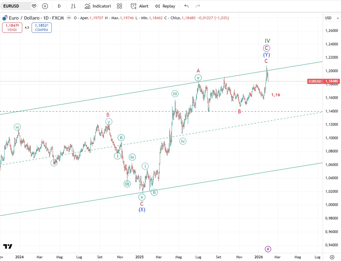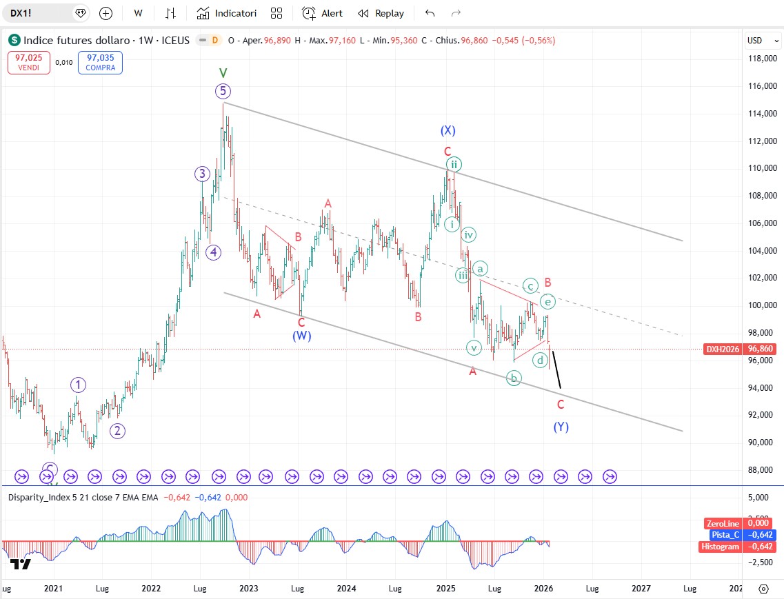 Quando martedì scorso il dollaro è sceso a rompere al ribasso il minimo del 17 settembre gli orsi si sono ringalluzziti velocemente spiegando il perché e il per come il dollaro deve scendere ancora, che nel breve periodo è uno scenario che convince anche il sottoscritto. Tuttavia per ora il conteggio delle onde non mi spinge ad immaginare una catastrofe per il dollaro. Nei piani di Trump sappiamo che vorrebbe un dollaro debole per tutta una serie di motivi che sarebbe lungo spiegare qua. Ma se ci limitiamo all’analisi tecnica manca sicuramente una gamba per formare le cinque onde dell’onda C ma questa ondata non dovrebbe scendere molto sotto quota 94 (diciamo tra 93 e 94). Per altro la relazione d’onda più frequente in un doppio zigzag è l’uguaglianza tra l’onda (W) e l’onda (Y) che si realizza nella fascia tra 94,50 e 95. Questo almeno ad oggi: poi se il quadro e la volatilità esploderanno nelle prossime settimane saremo pronti a cambiare idea. Ad oggi mi sento di dire che il dollaro dovrebbe essere abbastanza vicino a formare un minimo significativo e duraturo. Una solida chiusura sopra quota 98,000 se ci sarà. sarà un segnale iniziale che l'onda [B] di grado primario è completa e che l'onda [C] di grado primario sta iniziando a salire. Questa onda [C] rappresenterà il più grande rally del dollaro USA dal massimo di settembre 2022. Situazione da seguire.