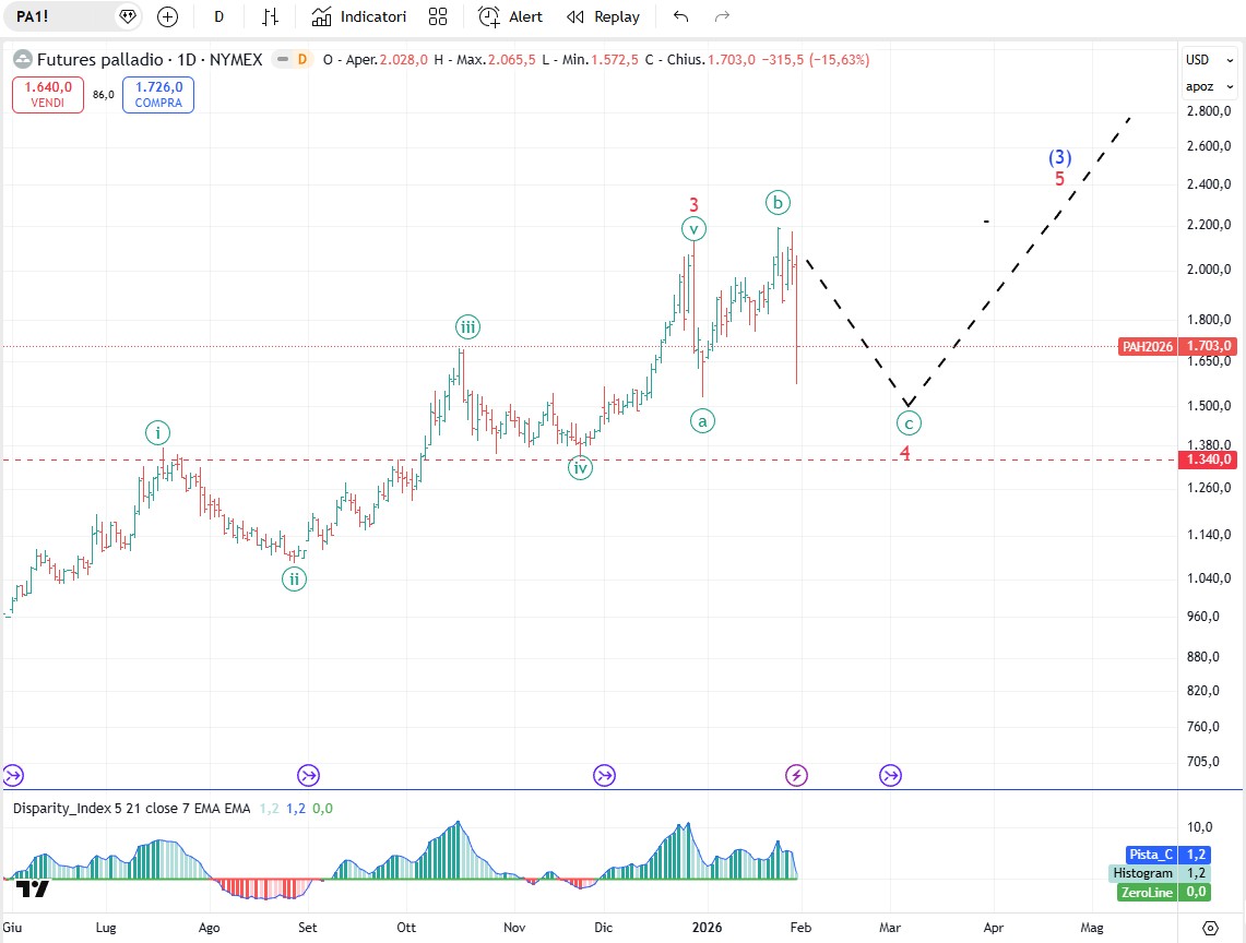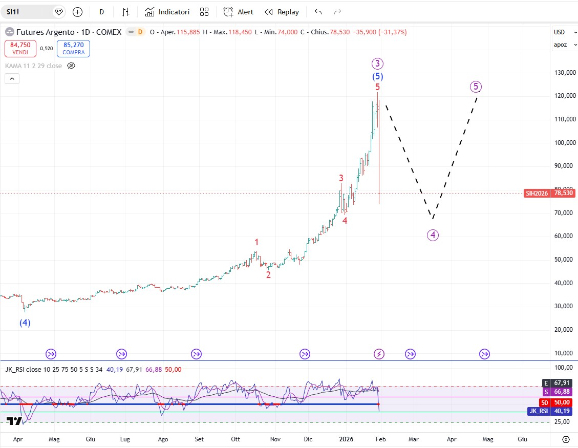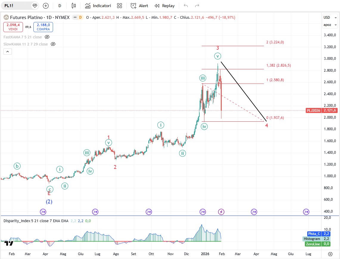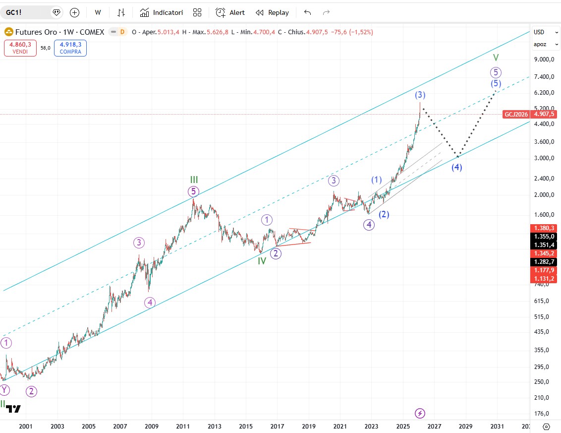 Negli ultimi tre mesi ho auspicato a più riprese una sana correzione sui preziosi anche per darci modo di riposizionarci a prezzi più convenienti. Beh le barre ribassiste di venerdì sull’intero comparto fanno ben sperare sul fatto che finalmente si stia avviando. Una correzione seria che duri almeno 3-4 mesi prima di riprendere la cora che nel medio/lungo sappiamo non si fermerà. Tanto per dare un’idea ai nostri lettori delle stime di blasonate banche e grandi investitori, i numeri che si leggono sono a dir poco da capogiro. Deutsche Bank prevede un prezzo dell'oro a 6.000 dollari, mentre JPMorgan prevede un prezzo tra gli 8.000 e gli 8.500 dollari. Un follower online dell'oro ha un obiettivo di 15.000 dollari, "ORA, non dopo". Infine il miliardario ex presidente del World Gold Council ha appena previsto che il prezzo dell'oro raggiungerà i 25.000 dollari. Bisogna sempre tener conto che anche in un trend rialzista di lungo periodo periodi di ritracciamento anche lunghi sono da mettere in conto per cui il timing non è un dettaglio da sottovalutare. Nel breve termine, un rally in controtendenza ritraccerà in linea di massima un 38,2 o un 50%. Più raramente puo spingere al 61,8%, ma sulle quarte onde il ritracciamento più frequente è del 38,2$.