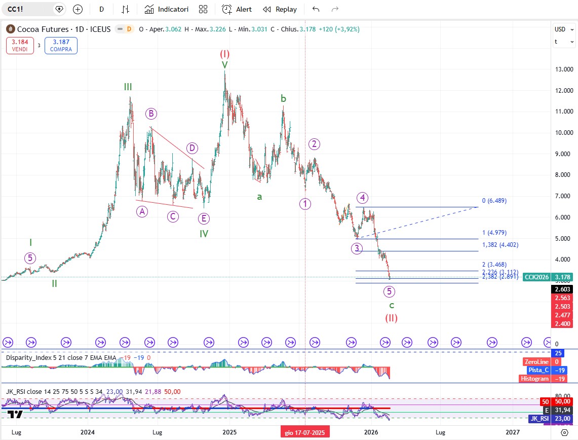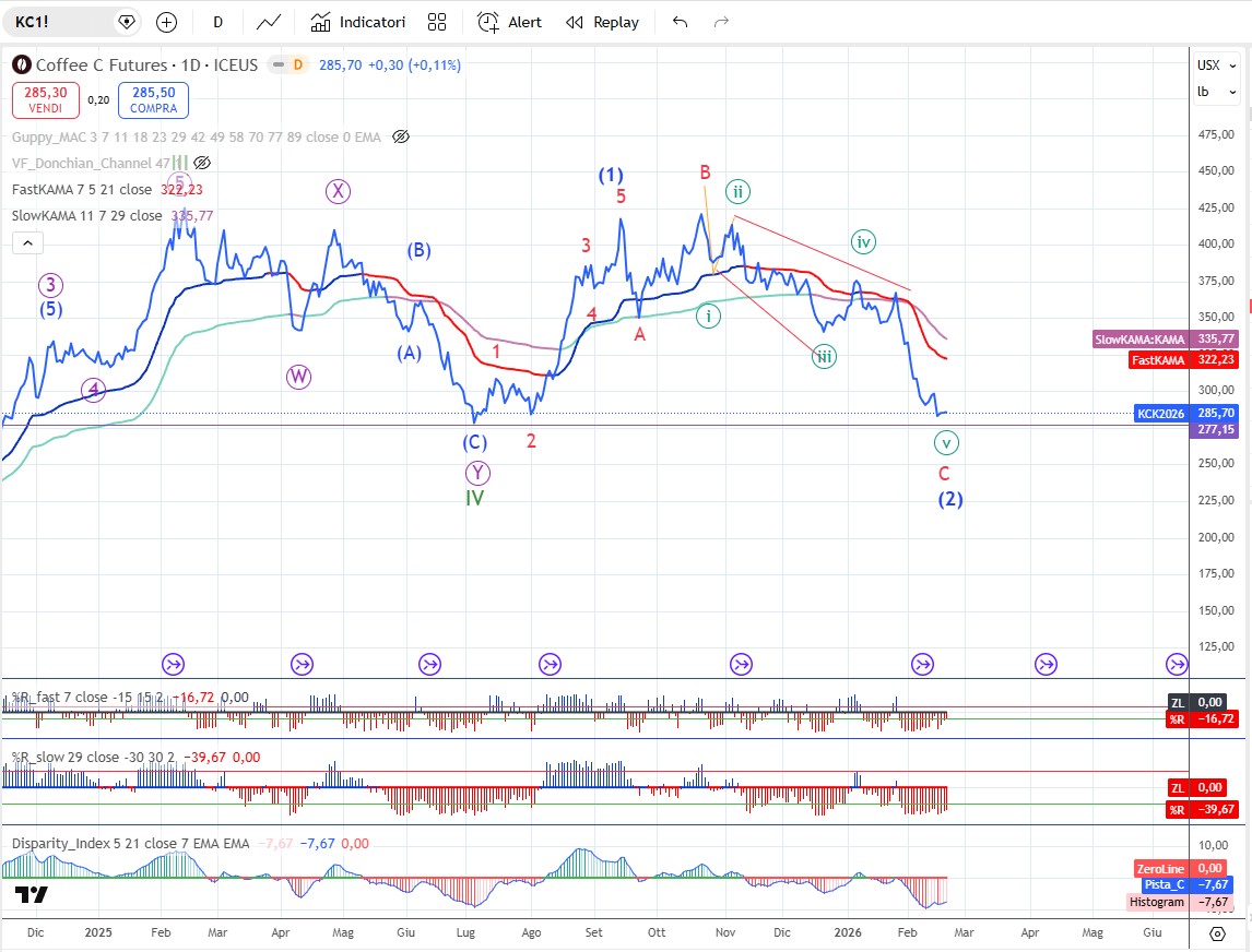 Sul caffè i prezzi di chiusura non hanno ancora invalidato l’origine dell’onda (1) ma è evidente che se non rimbalza ora il nostro conteggio salterà e il modello risulterà invalidato. Vediamo cosa succede questa settimana.