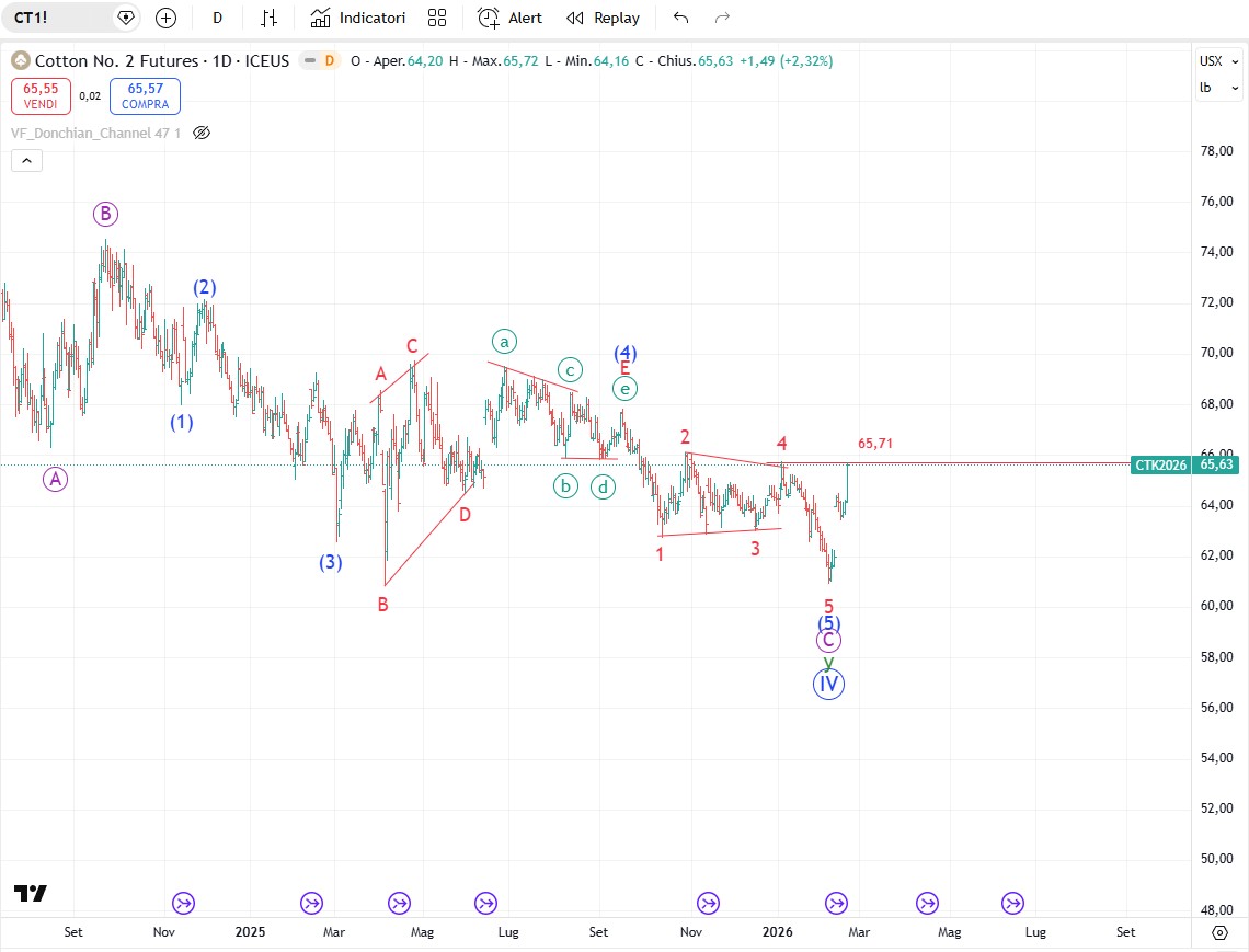 Ben il Cotone che arriva al test della resistenza offerta dalla precedente onda 4. Visto l’ampio gap aspetteremo di vedere l’onda 2 come si comporta se prova a chiuderlo o meno poi valuteremo se aprire posizioni long.