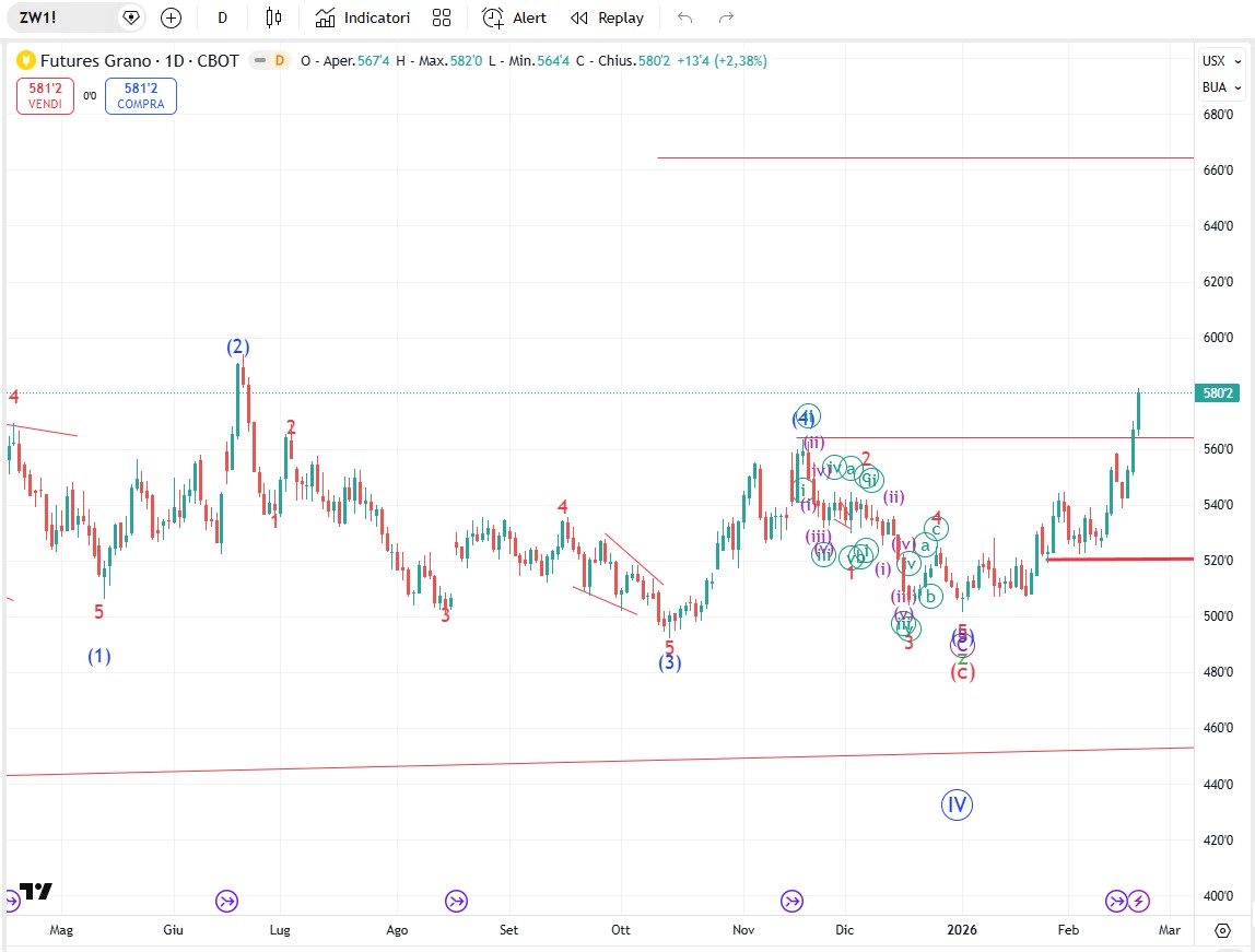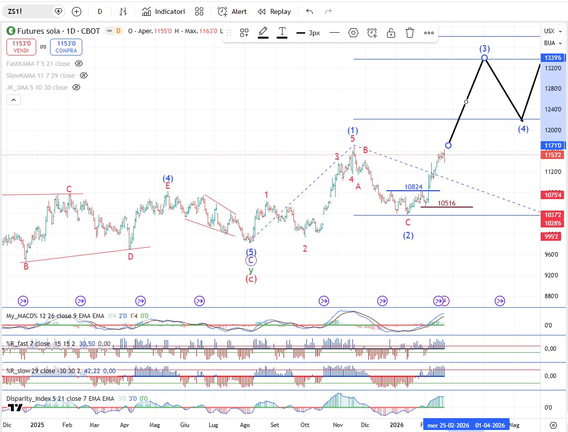 Bene la soia che avanza sull’onda (3) al rialzo. Questa settimana potrebbe esserci una piccola correzione ma il trend resta al rialzo.