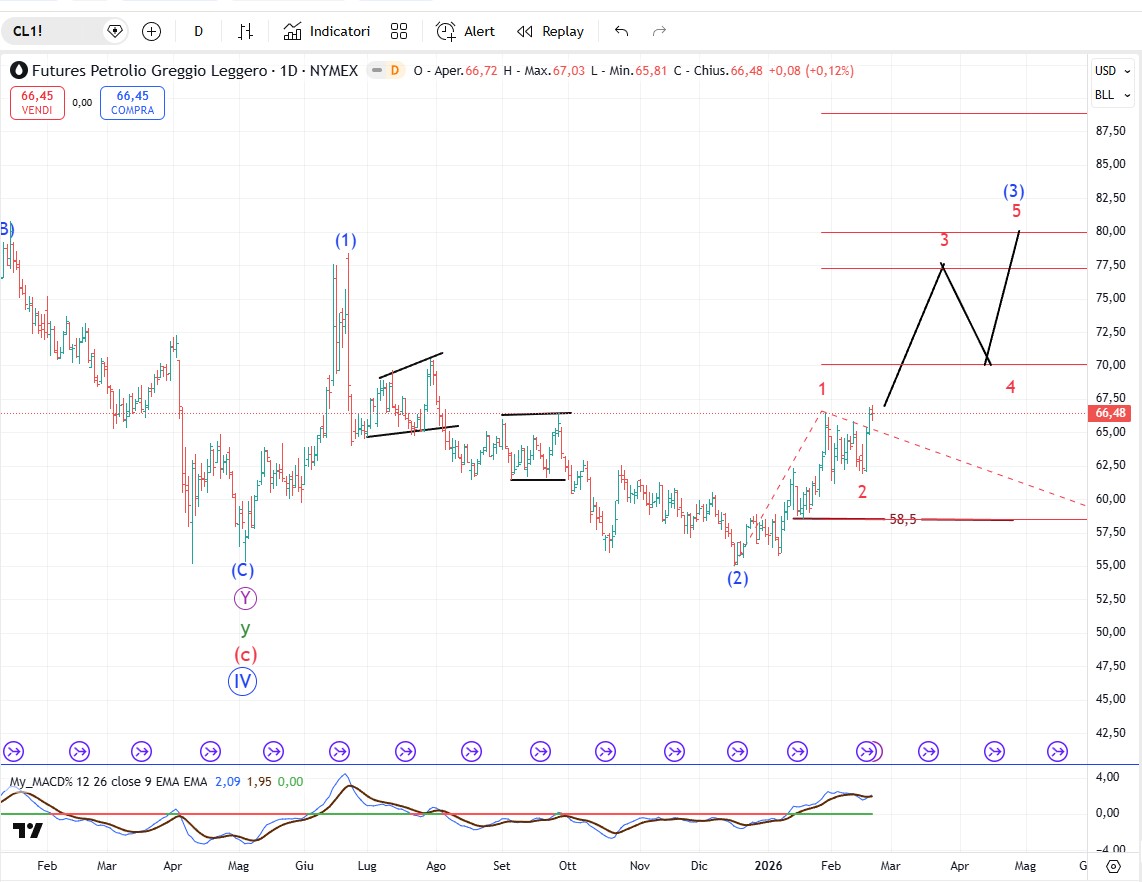 Bene anche il petrolio alle prese con la resistenza data dal massimo della precedente onda 1. Se il conteggio è corretto i prezzi dovrebbero salire oltre e raggiungere o avvicinarsi molto al massimo di giugno dello scorso anno.