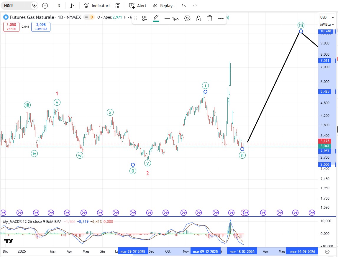 Il gas naturale dovrebbe aver concluso l’onda [ii] ed ora dovrebbe portare i prezzi ben più in alt cona successiva onda [iii].