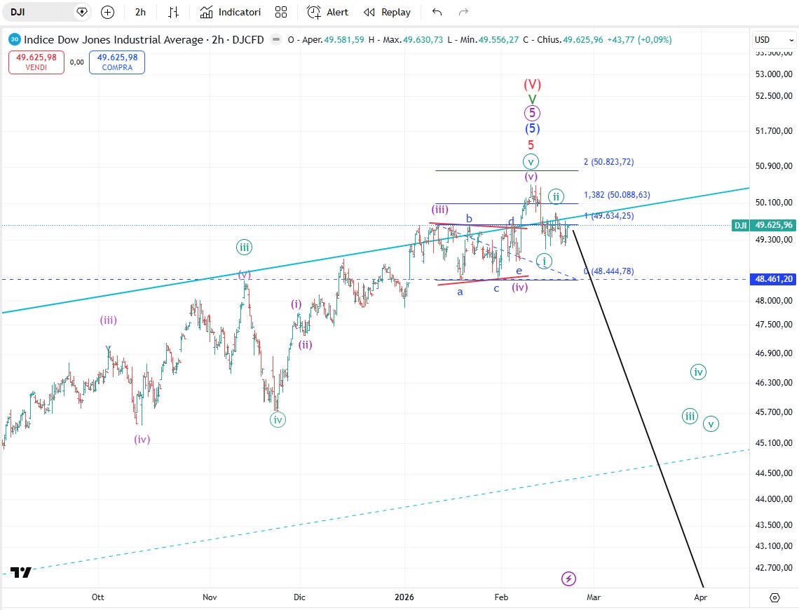 La svendita da 50.512,7 punti (massimo del 10 febbraio), a 49.084,30 punti , minimo del 13 febbraio, è un impulso, onda (i) al ribasso. Il rally a 49.897,30, (massimo del 18 febbraio), potrebbe aver completato l'onda (ii) di grado minute.. Se la nostra ipotesi è corretta la prossima mossa dovrebbe essere un’onda [iii] al ribasso per le prossime settimane. Il livello chiave per il potenziale ribassista del Dow Jones rimane il massimo di 50.512,7 punti. Come in precedenza, se l'indice supera questo massimo, la previsione ribassista verrà sospesa e cercheremo di capire come rivedere il modello d’onda.