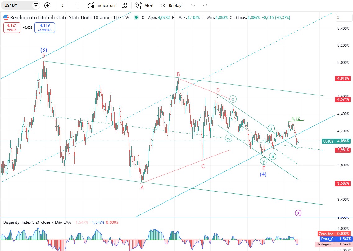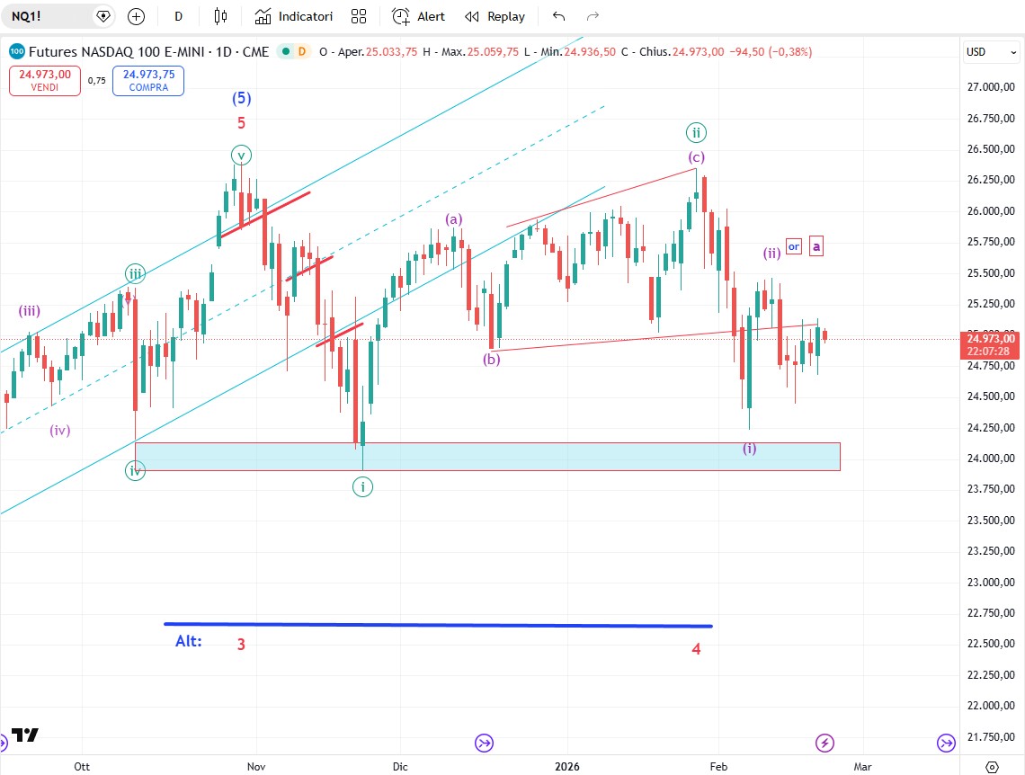 Il Nasdaq è sempre alle prese con la modellazione di un onda (ii)h che farà quello che vuole. Il nostro orizzonte è dato dal supportone che gira attorno ai 24.000 punti. Se e quando il Nasdaq non romperà al ribasso questo quasi triplo minimo noi staremo alla finestra mentre al di sotto cercheremo di aprire posizioni short.