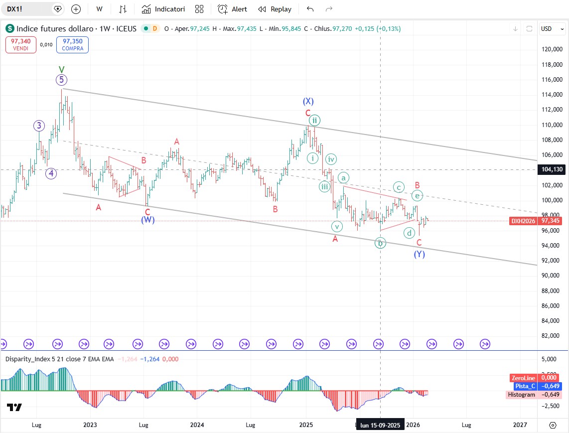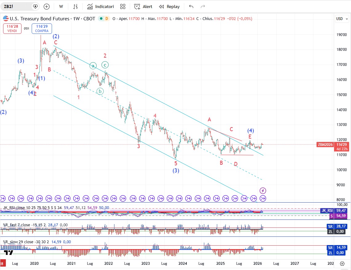 Sul trentennale del Tesoro USA, l’onda (4) di grado intermedio dovrebbe essere completa o quasi. L’onda ha assunto la forma di un triangolo. La prossima onda (5) porterà i prezzi dei titoli al di sotto del minimo dell'onda (3) di grado intermedio a 107,04 del 23 ottobre 2023. Il rendimento dei titoli del Tesoro USA a 30 anni salirà oltre il 5,179%, il massimo dell'onda (3). Una chiusura sopra 119,19 che è il massimo dell'onda C il 22 ottobre 2025, annullerà la previsione.