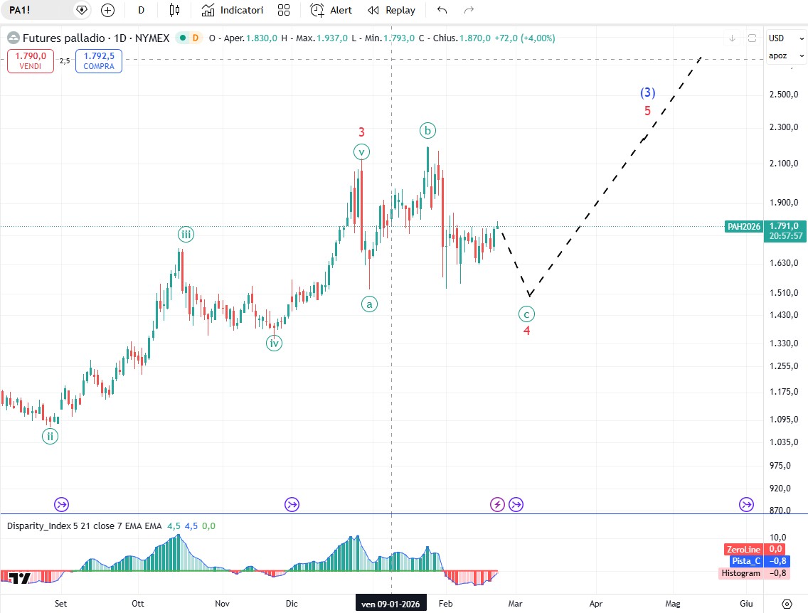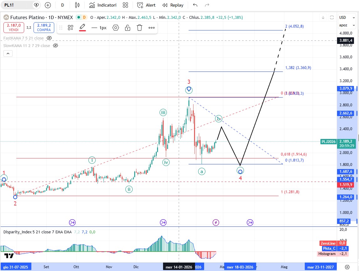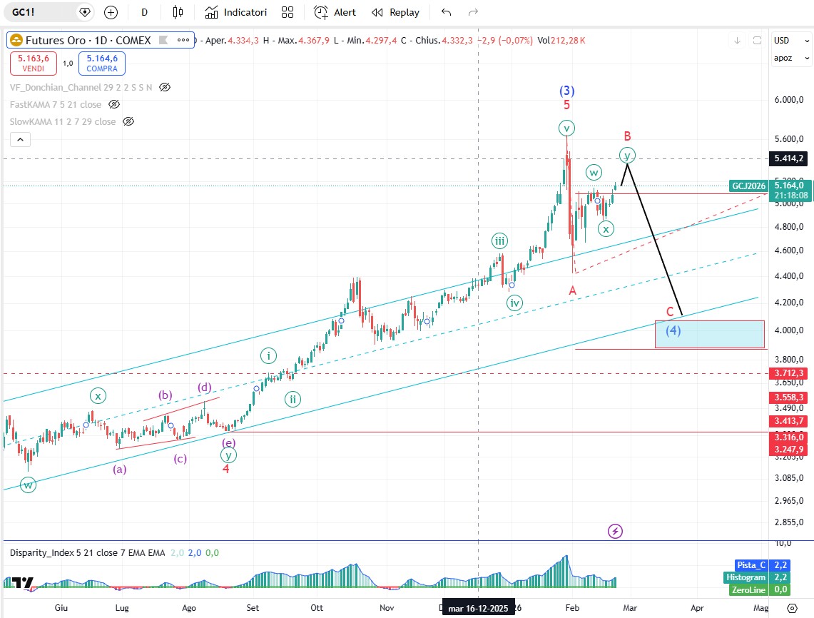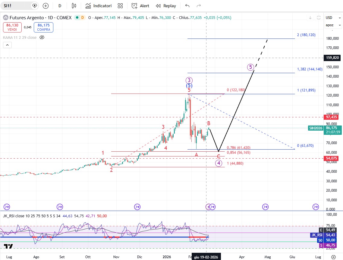 Sull’oro la correzione dell'onda (4) è iniziata a 5596,40$, (massimo del 28 gennaio). Il calo a 4403,55$, (minimo del 2 febbraio), è l'onda A di grado Minor dell’onda (4) di grado intermedio. Il rally del 2 febbraio è l'onda B di grado minor, che non sembra completa. Attualmente etichettiamo l'avanzamento come un doppio zigzag ma ci sono diverse altre opzioni. Una volta completata l'onda B, l'onda C farà scendere nuovamente i prezzi dell'oro. Una chiusura al di sotto di 4842,77$, (minimo del 17 febbraio), creerà ulteriori opzioni per l'onda (4), che non è completa.