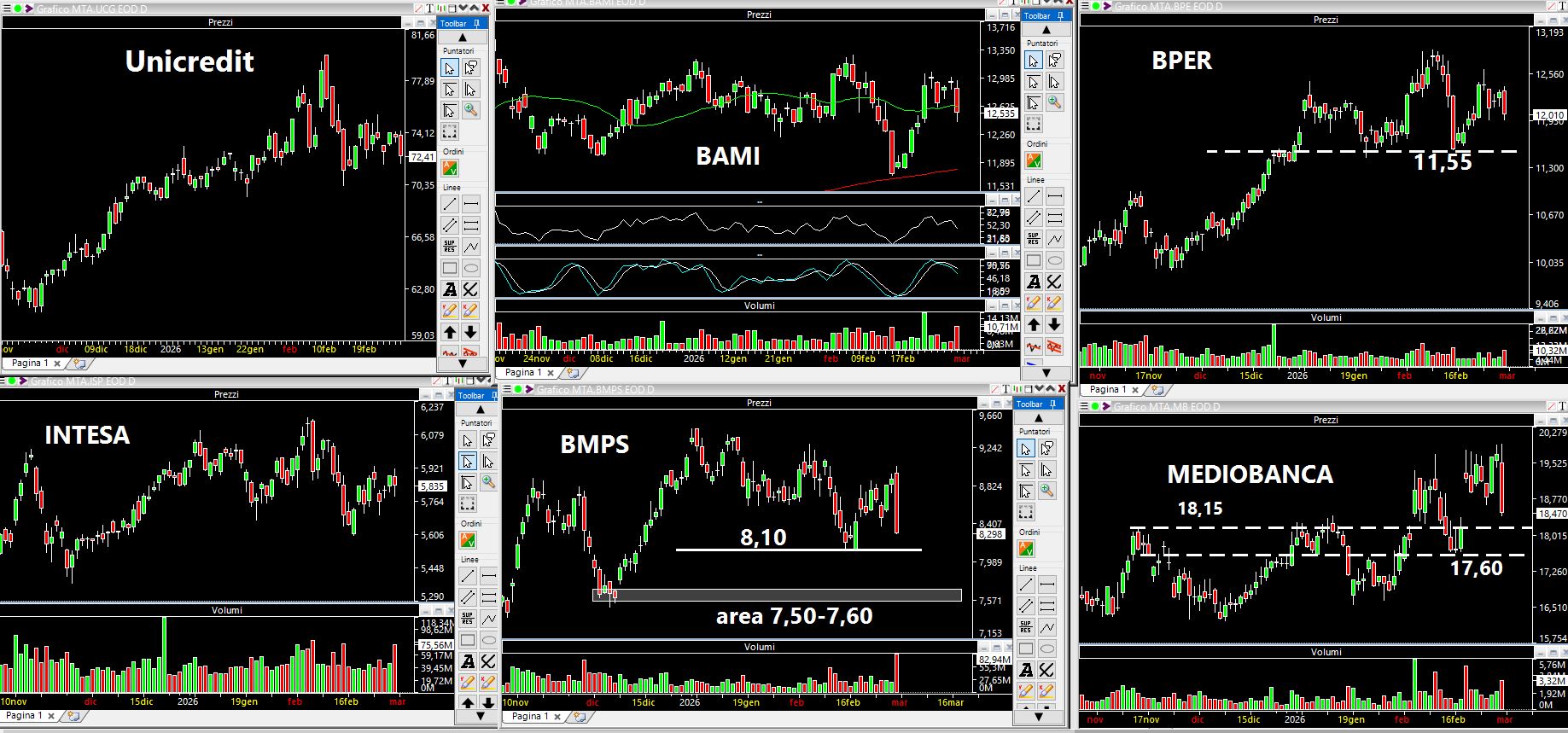 Il comparto bancario è stato ben venduto nell'ultima seduta settimanale, in modo particolare BMPS che si è portata dietro anche Mediobanca (poi sapete meglio di me che ogni scusa è sempre buona per programmare le macchinette in un verso o nell'altro). Mentre Unicredit, Banca Intesa SanPaolo e BAMI si sono mantenute su livelli più elevati, BMPS sembra abbia voglia di andare al test di 8,10 euro sotto i quali troviamo poi l'area di 7,50-7,60. Su Mediobanca abbiamo 18,15 euro e poi 17,60. Su BPER il supportone è a 11,55 ma se lo si raggiungesse potrebbe configurarsi l'ipotesi di un testa e spalle ribassista con neckline proprio attorno a 11,50 euro. Questi sono i motivi che mi spingono a ritenere che il nostro derivato non possa sovraperformare e quindi mi aspetto delle prese di profitto. I grafici che trovate di seguito sono tutti su scala giornaliera.