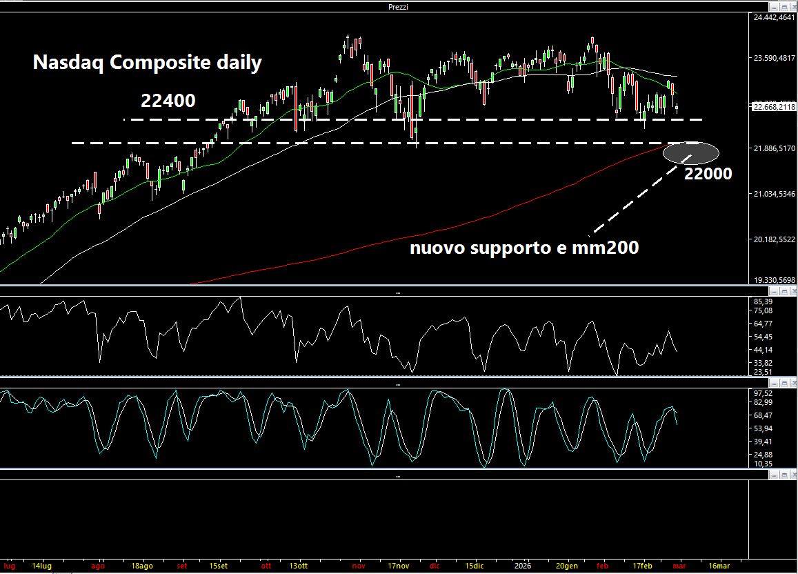 Il Nasdaq Composite sta "flirtando" col supporto a 22400 sotto il quale troviamo i 22000 punti dove tra le altre cose passa anche la media a 200 periodi di colore rosso.