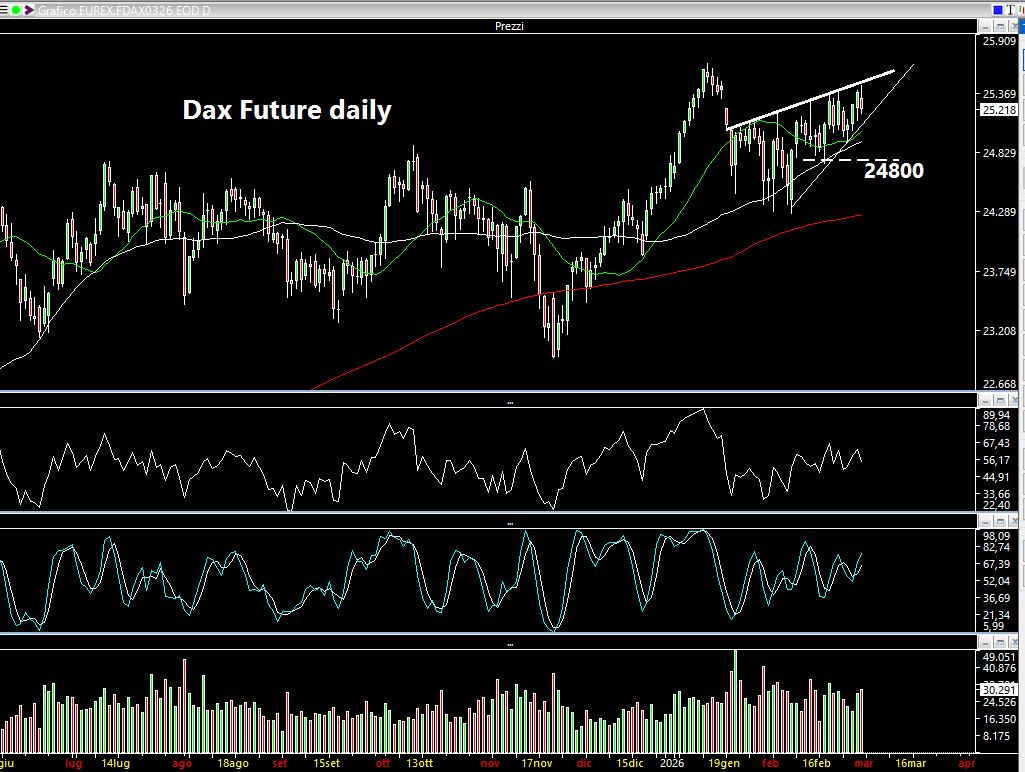 Il Dax Future daily ha chiuso la settimana a 25218 punti e ritengo importante che non scenda sotto i 24800 per pensare ad un attacco ai massimi. Insomma, la voglia di salire ci sarebbe ma si scontra quotidianamente con l'indecisione: osservate quante candele rosse e verdi si alternano nelle ultime settimane! Questo è un fattore già messo in evidenza sabato scorso e aggiungo anche che l'indecisione non è mai buona per la Borsa: prima o poi si stufa!